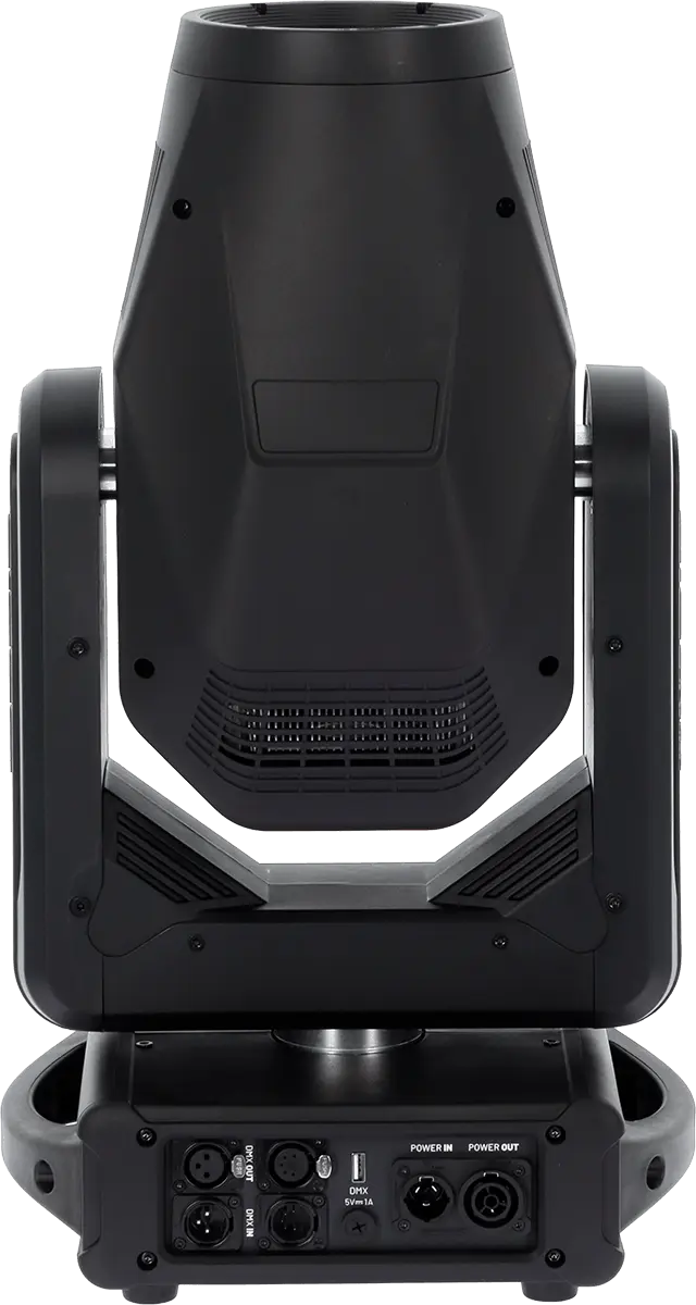 The MH200 is equipped with a comprehensive range of connectors to ensure perfect integration into any situation. You'll find DMX inputs/outputs in 3 and 5-point format, ensuring maximum compatibility with the majority of consoles, whether consumer or professional. Power is supplied via secure PowerCon T1 In/Out connectors, making it easy to daisy-chain multiple machines on a single power line. A unique feature: a dedicated USB port on the rear provides a 5V power supply, ideal for connecting a wireless DMX receiver and further simplifying your installations. Control can be provided via the control screen and 5 buttons on the front panel, or via 16 or 20-channel DMX modes, automatic, musical, master/slave, with RDM compatibility for remote parameter setting.