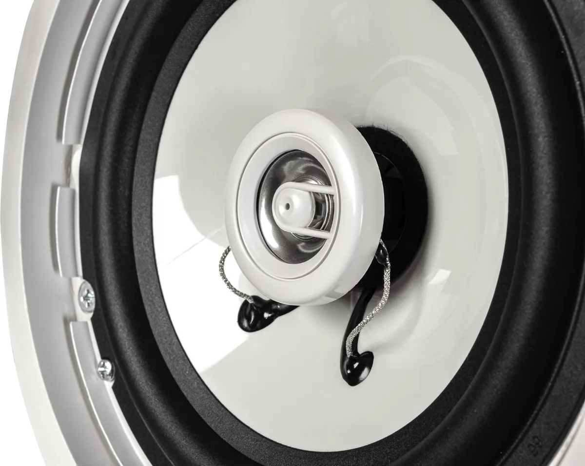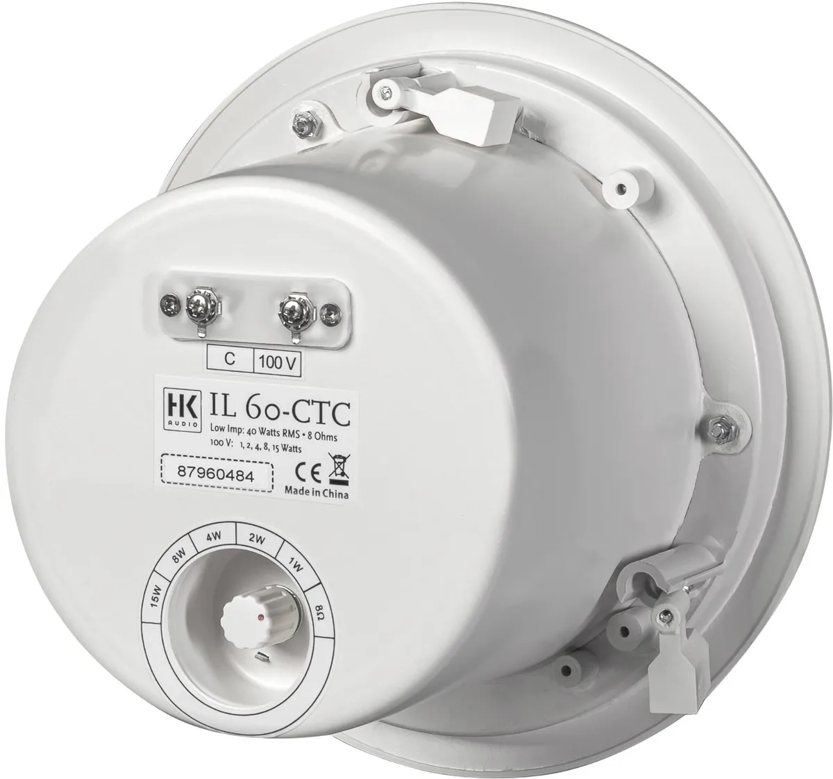This two-way speaker is designed for installation into ceilings. It is well-suited for background and near-field sound reinforcement in foyers, boutiques, bars, restaurants, shopping centers, airports and railway stations. The enclosure is loaded with a 6.5″ woofer and a 1″ tweeter with neodymium magnets. Both drivers are aligned in coaxial array. The IL 60 CTC features a built-in passive crossover and a 100V transformer with selectable power taps (accessible from below once the speaker installed). It is housed in a metal chassis. The front bezel is made of white polymer with a metal grille insert. The unit is installed using clamps that are accessible from below. This fullrange speaker”s frequency response is wide enough for use without a subwoofer.