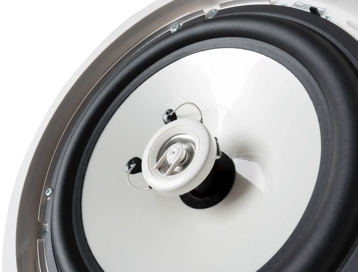 This two-way speaker installs into ceilings. It is well-suited for background and near-field sound reinforcement in foyers, boutiques, bars, restaurants, shopping centers, airports and railway stations. The enclosure is loaded with an 8″ woofer and a 1″ tweeter with neodymium magnets. Both drivers are aligned in coaxial array. The IL 80 CT features a built-in passive crossover and a 100V transformer with selectable power taps (accessible from below once the speaker installed). The front bezel is made of white polymer with a metal grille insert. It is installed using clamps that are accessible from below. This fullrange speaker”s frequency response is wide enough for use without a subwoofer.