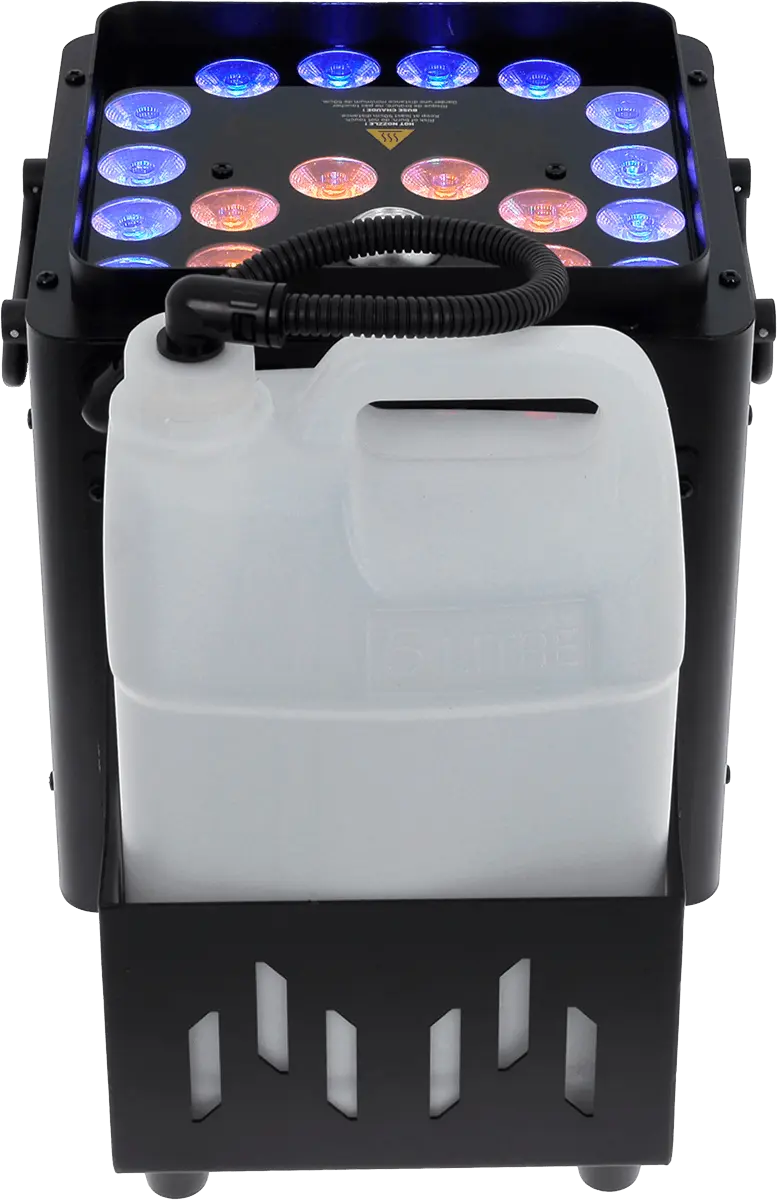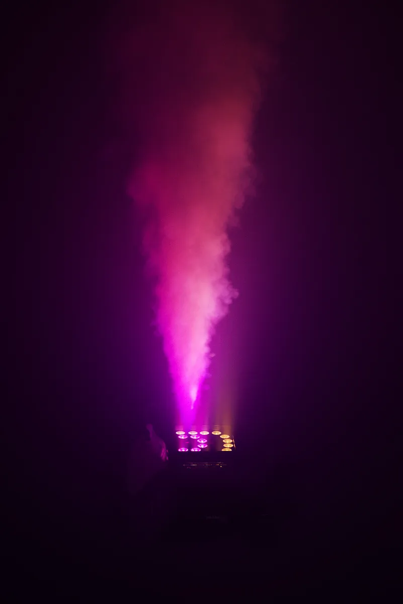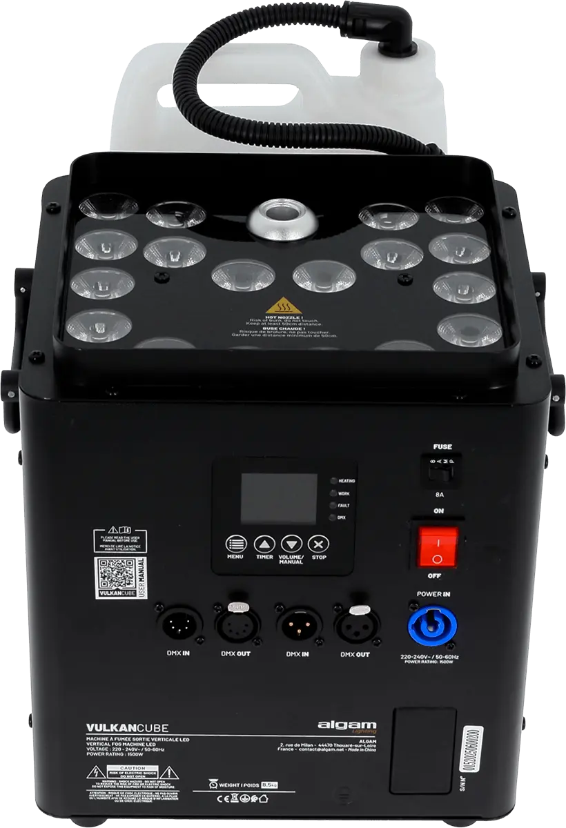 A spectacular smoke eruption for your events.The Vulkan Cube is a powerful 1500 W vertical smoke machine capable of propelling dense smoke jets up to 7 meters high. Its impressive output of 906 m³/min, combined with 18 multicolor LEDs (red, green, blue, warm white, yellow), creates stunning visual effects for any performance. Weddings, concerts, or DJ nights – it transforms every stage into a true show.Versatile and easy to use.With its DMX 512 control modes (17 channels), control screen, or wireless remote, the Vulkan Cube easily adapts to any technical setup. Its 5-liter tank provides comfortable autonomy for extended shows, while its 5 to 6 minutes heating time ensures quick operation. Ideal for event professionals, it is perfectly suited for both fixed installations and mobile performances. The Vulkan Cube is compatible with all types of fluids: low, medium, and high density, as well as quick-dissipating fluid.Built to last.With its compact steel chassis and a design focused on durability, the Vulkan Cube combines performance and reliability. Its optimized dimensions (360.5 × 260.5 × 340 mm) and balanced weight of 8.5 kg make transport and storage easier. It comes with a 5-liter container that can be swapped with an Algam Lighting liquid canister using the included adapted cap. A complete and efficient solution to enhance the visual impact of your events with ease.