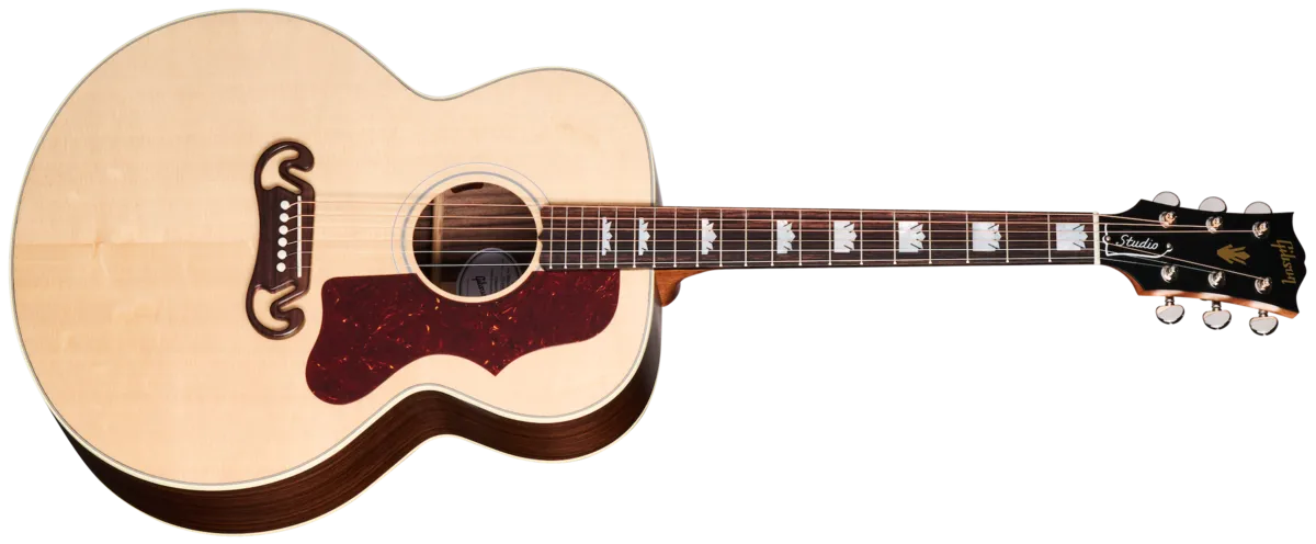 GIBSON STUDIO SERIES ACOUSTIC GUITARS ARE HANDCRAFTED IN BOZEMAN, MONTANA, AND BUILT TO WITHSTAND A LIFE IN THE SPOTLIGHT. NOW, BY POPULAR DEMAND, OUR ICONIC HUMMINGBIRD™ STUDIO, J-45TH STUDIO, AND SJ-200 STUDIO ARE AVAILABLE WITH GLOSS NITROCELLULOSE-FINISHED SITKA SPRUCE TOPS AND YOUR CHOICE OF ROSEWOOD OR WALNUT FOR THE BACK AND SIDES. WHETHER YOU ARE PLAYING IN BARS OR STADIUMS, ONBOARD L.. BAGGS™ ELECTRONICS ARE READY TO DELIVER THE GOODS NIGHT AFTER NIGHT, A HARDSHELL CASE WILL KEEP YOUR PRIDE AND JOY SAFE ON THE JOURNEY HOME, AND WE'VE EVEN THOUGHT OF THE LEFTIES OUT THERE.