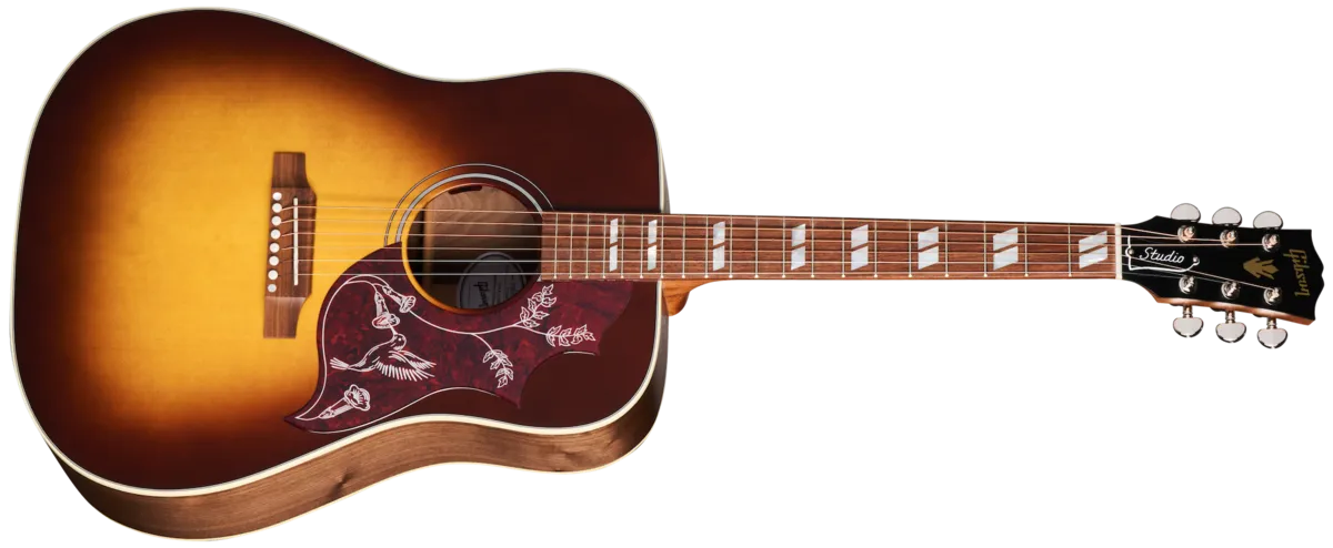 The Hummingbird™ Studio Rosewood continues Gibson's long history of producing world-famous square shoulder body designs, such as the Hummingbird, Dove™, and Songwriter models. The Hummingbird Studio Rosewood is handcrafted in Bozeman, Montana, using all-solid tonewoods, including a gloss nitrocellulose lacquer-finished Sitka spruce top for wide dynamic range, playing responsiveness, and balanced tone. The satin nitrocellulose lacquer-finished rosewood used for crafting the back and sides delivers a bit more rich-sounding bass and sparkling treble overtones than the traditional mahogany-bodied Hummingbird models. The Hummingbird Studio Rosewood's full-depth body ensures rich, deep tone and excellent volume and projection. The Hummingbird Studio Rosewood is equipped with an Advanced Response profile and satin nitrocellulose lacquer-finished utile neck for smooth, easy playability. The Advanced Response neck profile sits in between some of the other Gibson neck profiles and is not too large or too thin but sits "just right" in the hand for many players. The rosewood fretboard has 20 standard-sized frets and is adorned with the classic mother-of-pearl parallelogram inlays that are one of the visual hallmarks of the classic Hummingbird design. The fretboard's 16" radius makes playing fast passages easy and efficient, contributing further to the model's excellent playability. You'll find yourself reaching for this guitar again and again since playing it is so enjoyable. The headstock is equipped with smooth-turning Grover® Rotomatic® tuning machines and a Graph Tech® TUSQ® nut for excellent tuning stability SO you can spend more time playing and less time tuning. The saddle and bridge pins installed on the rosewood bridge plate are also TUSQ. The Hummingbird Studio's pickguard graphics deliver another classic Hummingbird visual touchstone. The Hummingbird Studio Rosewood has an L.R. Baggs™M Element Bronze active under-saddle piezo pickup with a quick-to-access soundhole-mounted volume control for easy studio-quality plug-and-play anywhere. Packaged in an included hardshell case for portability and protection, the Hummingbird Studio Rosewood is ready to join you wherever your muse takes you.