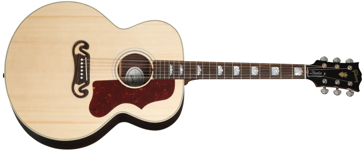 The Gibson SJ-200 ™ was first introduced in 1937 as the Super Jumbo. With its Super Jumbo body size and excellent projection, the SJ-200 still makes an undeniable statement like no other acoustic guitar. From country to folk, Americana to rock 'n' roll, countless musical icons have picked the SJ-200 to make some of the world's most beloved music. Now, Gibson is proud to introduce the updated SJ-200 Studio Rosewood. The SJ-200 Studio Rosewood is handcrafted in Bozeman, Montana, using all-solid tonewoods, including a gloss nitrocellulose lacquer-finished Sitka spruce top for wide dynamic range, playing responsiveness, and balanced tone. The satin nitrocellulose lacquer-finished rosewood used for crafting the back and sides delivers more rich-sounding bass than the more commonly seen maple-bodied SJ-200 models, just like some of the rare rosewood-backed vintage SJ-200 models from the pre-war era. The SJ-200 Studio Rosewood's full-depth body ensures rich, deep tone and outstanding volume and projection for which this model is famous. The SJ-200 Studio Rosewood is equipped with an Advanced Response profile and satin nitrocellulose lacquer-finished utile neck for smooth, easy playability. The Advanced Response neck profile sits in between some of the other Gibson neck profiles and is not too large or too thin but fits "just right" in the hand for many players. The rosewood fretboard has 20 standard-sized frets and is adorned with the classic mother-of-pearl graduated crown inlays, one of the visual hallmarks of the classic SJ-200 design. The fretboard's 16" radius makes playing fast passages easy and efficient, contributing further to the model's excellent playability. You'll find yourself reaching for this guitar again and again since playing it is so enjoyable. The headstock is equipped with smooth-turning Grover® Rotomatic® tuning machines and a Graph Tech® TUSQ® nut for excellent tuning stability SO you can spend more time playing and less time tuning. The saddle and bridge pins installed on the rosewood bridge plate are also TUSQ. The SJ-200 Studio Rosewood has an L.R. Baggs™ Element Bronze active under-saddle piezo pickup with a quick-to-access soundhole-mounted volume control for easy studio-quality plug-and-play anywhere. Packaged in a modern hardshell case for portability and protection, the SJ-200 Studio Rosewood is ready to join you wherever your music takes vou.