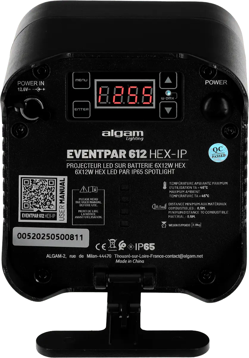 The EVENT PAR 612 HEX IP is a professional PAR projector designed to meet the needs of the most demanding performances. Thanks to its built-in lithium-ion battery and IP65 rating, it can be used both indoors and outdoors, whatever the conditions. Its compact and robust design allows for quick and flexible installation for a variety of events: concerts, weddings, or temporary architectural installations.