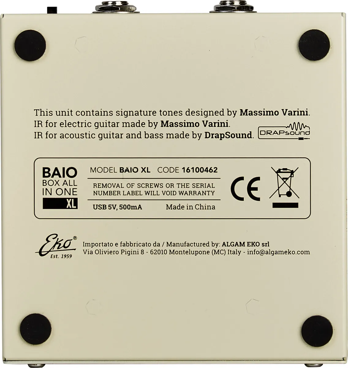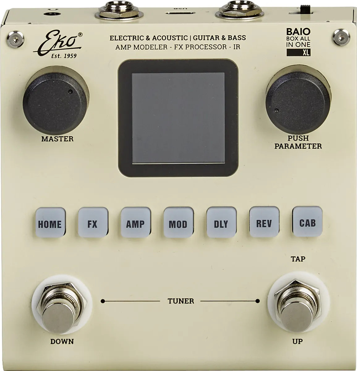 Discover the BAIO XL (Box All In One), the compact effects pedal that combines all the power of a professional pedalboard in a single unit. Designed for electric, acoustic, and bass guitars, it offers 80 presets (40 factory + 40 user) that are fully customizable, giving you complete freedom to create your own signature sound. With 6 built-in effects modules, with flexible order: Noise Gate, Boost, Compressor, 3-band EQ, 20 amp models, modulation effects, delays, and reverbs - you have a complete sound arsenal at your feet. Its secret lies in its Impulse Response (IR) technology, high-quality sounds developed with Massimo Varini and the DrapSound library, for a natural, rich and inspiring sound worthy of the best stages and studios.