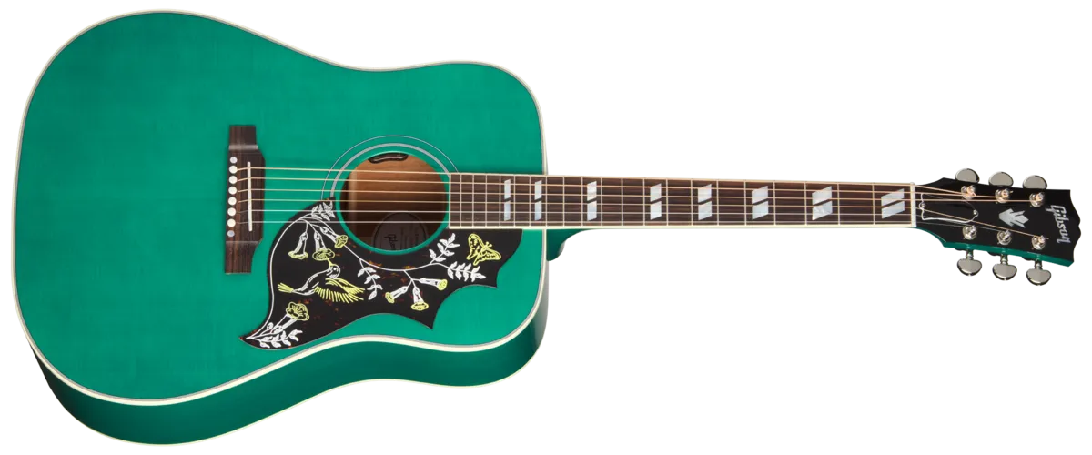 Much of the Hummingbird's appeal lies in its versatility. No matter how you attack this flat-top, it pumps out rich, deep tones, and is equally at home strumming first-position chords as it is taking the spotlight for picking lead lines. This versatility has made it the choice of musical legends across genres. Its spacious mahogany body and sweet, select Sitka spruce top are more than capable of nailing down the rhythm in the hands of a rock and roll sideman or accompanying the most nuanced performance under the fingers of today's alternative singer-songwriter. The Hummingbird's mahogany neck has a comfortable, Rounded profile and is adorned with classic mother-of-pearl parallelogram inlays. It is fitted to the body with a compound dovetail neck joint for outstanding resonance and sustain. This 'bird has a TUSQ® nut, saddle, and bridge pins. The low-friction TUSQ nut, along with the Grover® Rotomatic@ tuners, ensures solid tuning stability, so you can spend more time playing and less time tuning. The Hummingbird Standard also sports the iconic Hummingbird ™ graphics on the pickquard, and is equipped with L.R. Baggs® VTC electronics, so it's ready to plug in on stage or in the studio, from the moment you take it out of the included hardshell case.