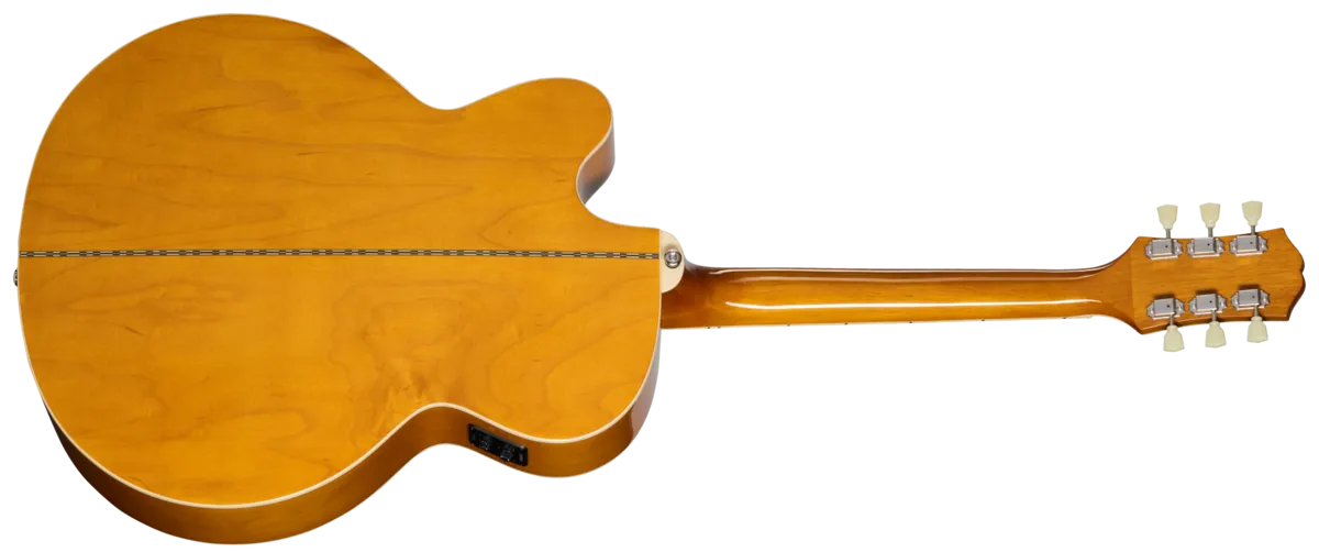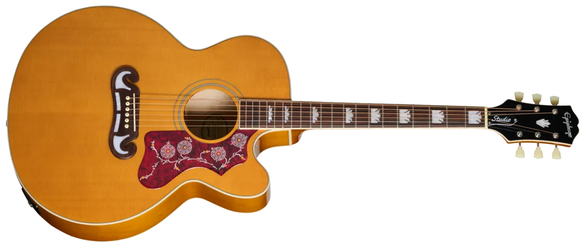 We also included other features that give the J-200 Studio EC even more vintage-style visual pizazz, including an iconic J-200 style tortoise shell-colored pickguard with classic two-color J-200 graphics, Epiphone Deluxe tuners with Keystone buttons, and a bound 60s Kalamazoo-style headstock with the Epiphone logo and Gibson Crown proudly displayed in mother of pearl. The J-200 Studio EC comes with Fishman® electronics, including an S-Core under-saddle pickup and Fishman Presys T™ II preamp with side-mounted volume, bass, treble, and phase controls. It also has a convenient built-in electronic tuner that makes tuning up quick and easy. The Epiphone J-200 Studio EC has a gloss finish and is offered in two vintage-inspired colors-Natural and Vintage Sunburst. Both right-handed and left-handed versions are available. A standard gig bag is also included.