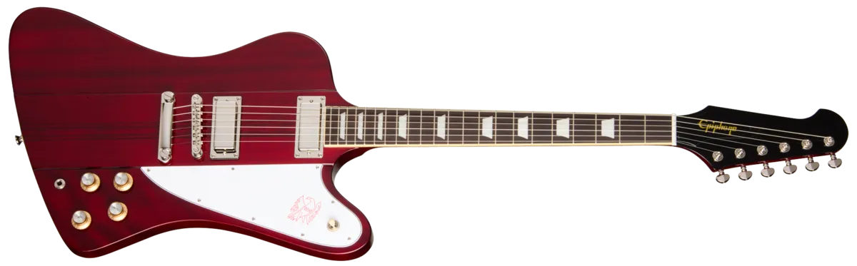 Epiphone's Inspired by Gibson Firebird ™ rocks the reverse body and headstock design that appeared on the Firebird when it was originally introduced in 1963. The Firebird was designed by famous automotive designer Ray Dietrich and was Gibson's first neck-through-body design. The Firebird features a traditional 9-ply mahogany and walnut neck-through-body design, providing rich, warm tonality and incredible sustain. Due to the neck-through-body design, the tuners, pickups, bridge, and tailpiece are all mounted on the same pieces of wood, providing exceptional resonance. The neck, featuring a SlimTaper C neck profile, is equipped with a bound rosewood fretboard and 22 medium jumbo frets, along with pearloid trapezoid position marker inlays, offering undeniable style and fast and effortless playability.