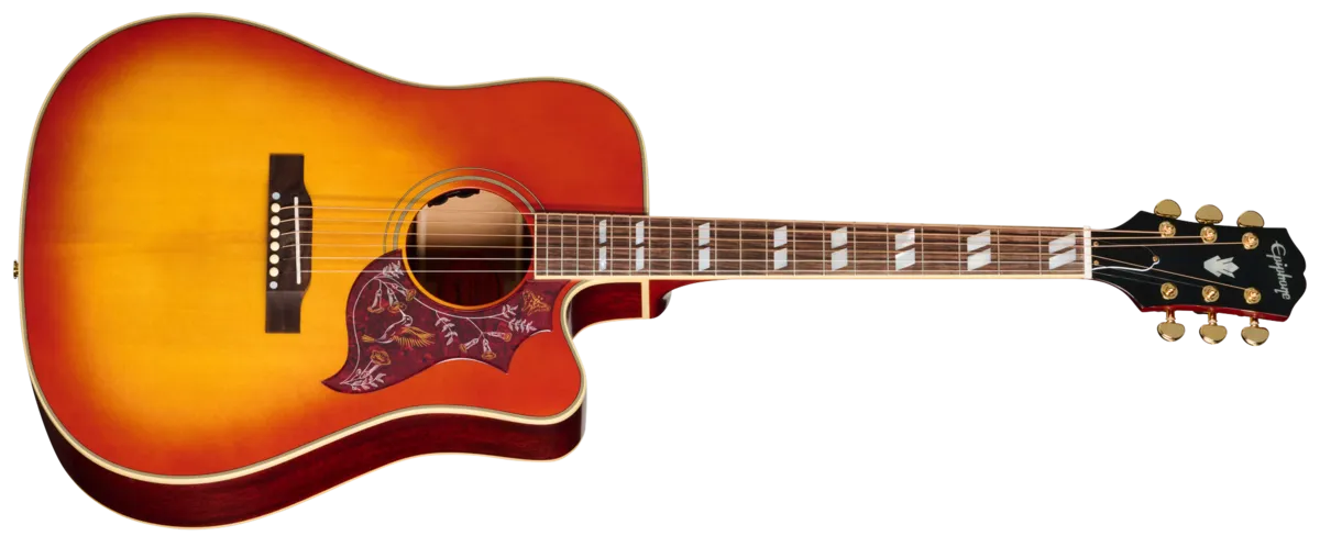 The Gibson Hummingbird was Gibson's first square-shouldered acoustic model and has been one of the world's best-loved and most instantly-identifiable acoustic guitars since it was first introduced in 1960. Renowned for its versatility, it's equally at home playing first-position chords or punchy acoustic lead lines, and has been used in a wide range of musical genres by countless artists.Now, Epiphone is very proud to introduce the Hummingbird Standard EC, an Inspired by Gibson version of the world-famous Hummingbird with some notable updates that make this iconic guitar better than ever. The Hummingbird Standard EC features all solid wood construction, including a solid mahogany back and sides that are paired with a solid spruce top, which is the classic Hummingbird tonewood recipe that delivers all the sweet tones the Hummingbird is famous for. The body features a cutaway that makes this 'bird even more expressive and allows for easier access to the upper regions of the fretboard. The mahogany neck is equipped with a rosewood fretboard that is outfitted with 20 standard frets and adorned with beautiful mother-of-pearl split parallelogram inlays. The belly-up bridge is also rosewood, and the saddle and nut are bone. The newly-redesigned pickguard is the epoxy style and features the iconic hummingbird, butterfly, and flowers graphics that are a visual hallmark of the Hummingbird. Quality Grover® Rotomatic® tuners ensure solid tuning stability, so you can spend more time playing and less time tuning up. When you do need to tune up, the onboard Fishman® electronics include a built-in tuner, as well as side-mounted controls for volume and EQ, making this Hummingbird ready for use on-stage and in the studio. A premium gig bag is also included to help keep the Hummingbird Standard EC safe and for easy grab-and-go transport to your next jam session, rehearsal, or gig.A battery is not included. To power your pickup, you will need a 9-volt battery.