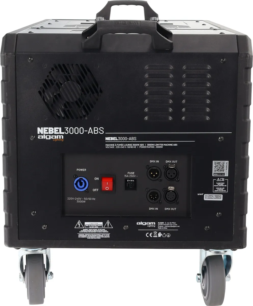 Built for professional use and permanent installations, the NEBEL3000 ABS features a solid ABS chassis, offering excellent impact resistance while remaining lighter than comparable metal constructions. It includes a 2 L fog fluid tank, ideal for long-lasting performances, as well as a water level indicator for easy monitoring. With a net weight of 30.6 kg and dimensions suited to high-output atmospheric machines, it remains practical to handle and transport for touring and event applications thanks to the 4 wheels delivered.