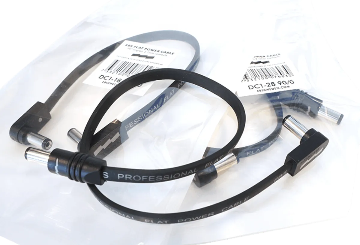 EBS DC1-68 90/90 Flat Power Cable; Power Supply Connector: 2.1 mm Right Angle Barrel Plug, Pedal Connector: 2.1 mm Right Angle Barrel Plug, Polarity: Standard (Center Negative), Lenght: 68 cm