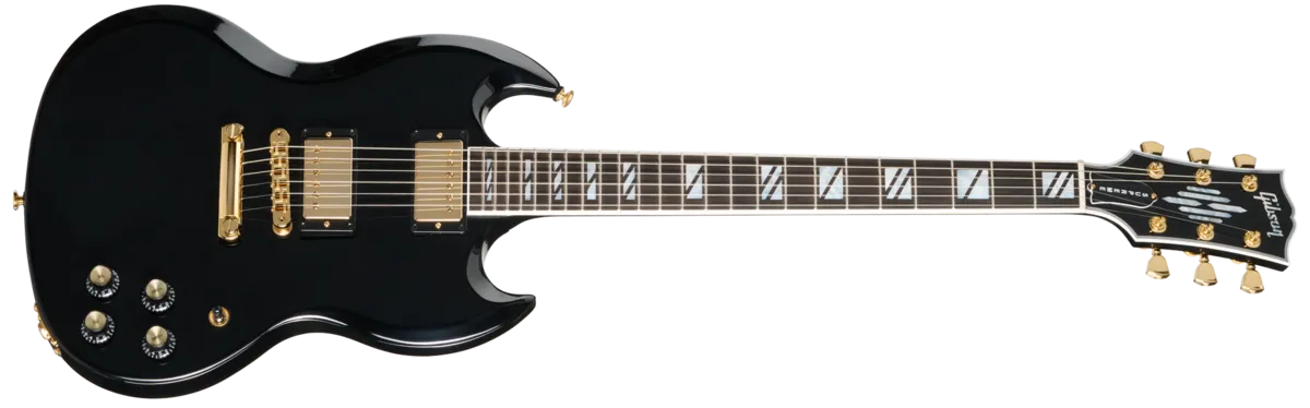 The return of the SG™ Supreme has resonated strongly with players, quickly establishing it as one of the most compelling introductions of the past year. Its updated appointments and refined design struck a chord, and continued player enthusiasm has led to the arrival of a new two-pickup configuration finished in a rich, opaque Ebony. The Gibson SG has remained one of the brand's most enduring and widely admired models, trusted by musicians around the world and across countless musical styles. With the SG Supreme, Gibson elevates this classic platform into a premium instrument that blends cutting-edge performance with eye-catching visual sophistication.At its core, the SG Supreme combines a plain maple top with a mahogany body, presented without a pickguard for a smooth, contemporary look. A mahogany neck with a fast Slim Taper T™ profile is paired with an ebony fretboard featuring a 10"-16" compound radius, delivering comfort for first-position chords and effortless bends higher up the neck. Twenty-four medium jumbo frets provide expanded range, while Super Split Block mother-of-pearl inlays add a refined aesthetic. The headstock showcases a newly developed mother-of-pearl "Chandelier Inlay," inspired by an original 1940s design uncovered in the Gibson archives. Locking Grover® tuners with Keystone buttons, working alongside a Graph Tech® nut, ensure exceptional tuning stability, while the aluminum Nashville Tune-O-Matic ™ bridge and aluminum Stop Bar tailpiece contribute to precise intonation and strong sustain.Sound is delivered by a Burstbucker™ Pro and Burstbucker Pro + pickup set, wired with push/pull volume controls for coil tapping and individual tone controls for further shaping. The timeless Ebony finish is complemented by gold hardware, resulting in an instrument that is as visually striking as it is sonically versatile. For players seeking a no-holds-barred guitar that excels in sound, feel, and appearance, the SG Supreme represents the leading edge of modern Gibson craftsmanship. A hardshell case is included for secure transport and protection.