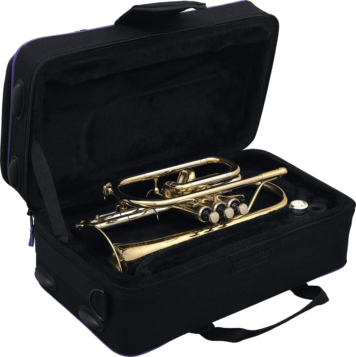 Rose brass leadpipe, medium large bore. Thin bell 125mm diameter, enriched with copper for a soft sound. Beautiful engraving. Metal piston buttons, heavy bottom caps. Triggers on 1st and 2nd valve slides. Deluxe soft case backpack.