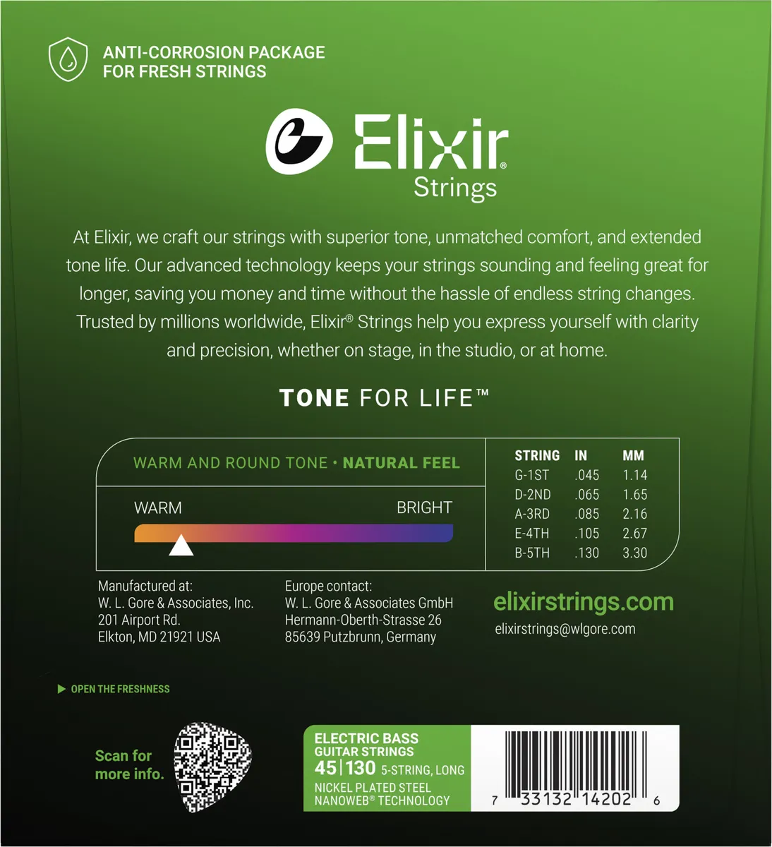 Elixir® Nickel Plated Steel Bass Strings with a NANOWEB® Coating deliver a rich, rounded tone with greater clarity and heavier mid-range presence.