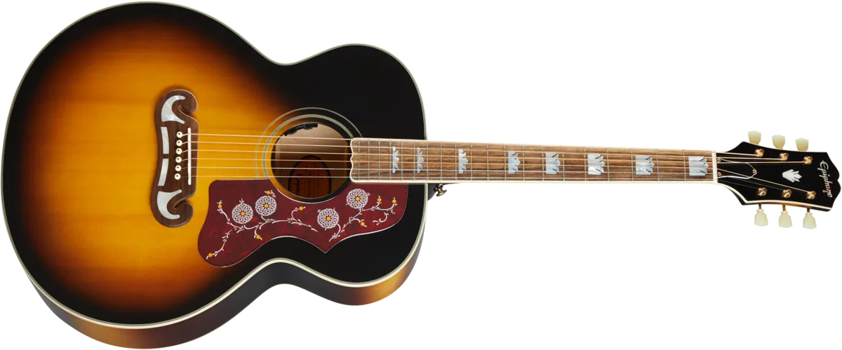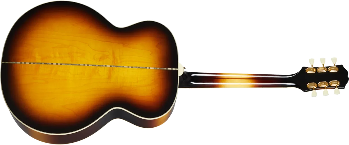 All Hail the King! The Epiphone Inspired by Gibson™ J-200™ is a stunning homage to the King of the Flat-Tops - the world-famous Gibson™ SJ-200. Since its introduction in 1937 it has been the choice of "singing cowboys" like Tex Ritter and Gene Autry, as well as folk, rock and country royalty, including Emmylou Harris, Elvis, Jimmy Page, Bob Dylan, George Harrison, The Edge, and many more. Featuring a Super Jumbo non-cutaway solid figured maple body, solid Sitka spruce top, and two-piece maple neck with a mahogany center strip, the Epiphone J-200 is built with all solid woods for outstanding tone. The visual elements have always been a big part of the J-200's appeal, and the Epiphone Inspired by Gibson J-200 includes a Moustache™ bridge with curved block inlays, Crown headstock inlay and Graduated Crown mother of pearl fingerboard inlays, and a J-200 style pickguard with two-color graphics. Available in Aged Antique Natural Gloss and Aged Vintage Sunburst Gloss finishes.