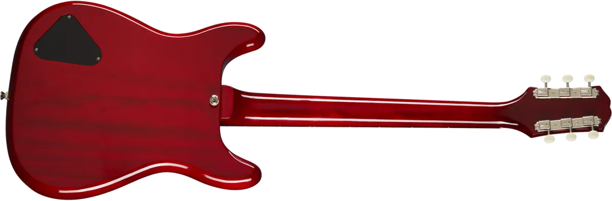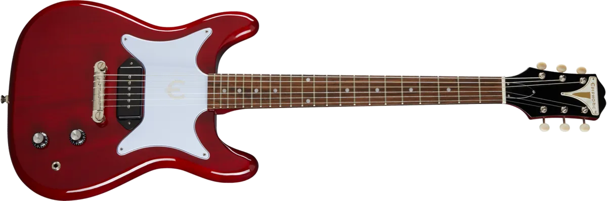 First introduced in 1958, the Epiphone Coronet was one of Epiphone's first and most successful original solid body electric guitar designs. The latest version brings back many of the features of the early Coronet models including the symmetrical double-cutaway mahogany body with a single Epiphone PRO™ P-90 Dogear pickup, three on a side reduced sized Kalamazoo headstock with Epiphone Bikini badge and ivory button tuning machines, and a white butterfly pickguard with foil E logo. The Epiphone Coronet comes equipped with a glued-in mahogany neck with a medium C profile, Indian laurel fretboard with 12" radius and 22 medium jumbo frets, 1 volume and 1 tone control with CTS® potentiometers, and an Epiphone Lightning Bar compensated wraparound bridge.