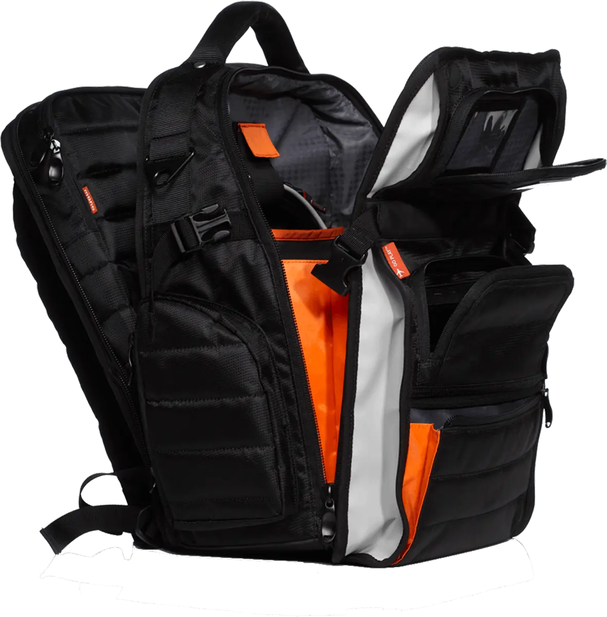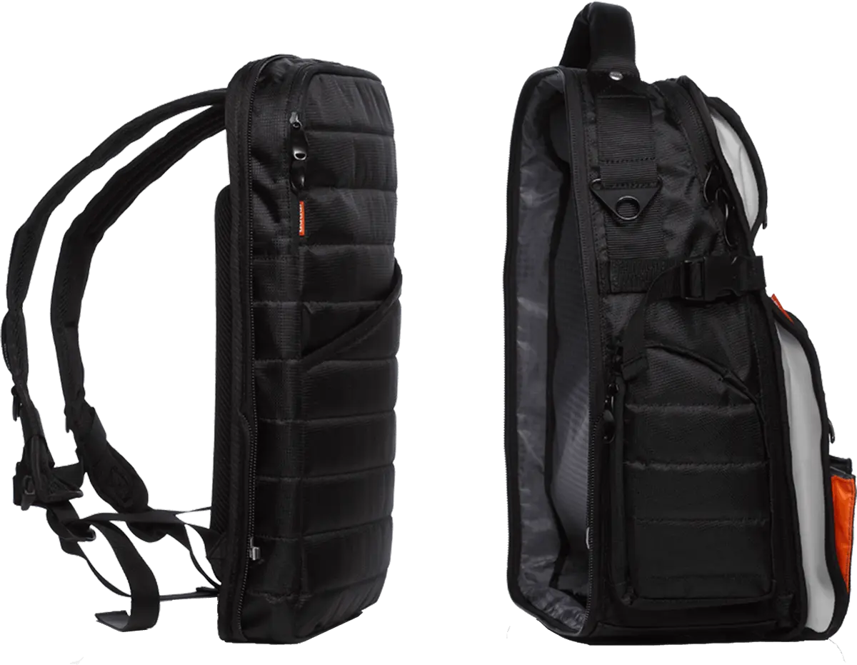 MONO er kjent for sine geniale løsninger når det gjelder oppbevaring, Classic FlyBy Backpack er ikke noe unntak i så måte. Rommet bak passer en 17” laptop i et separat etui. Hovedlommen har kabelholder, rom for kontrollere, harddisker eller Vinyl.