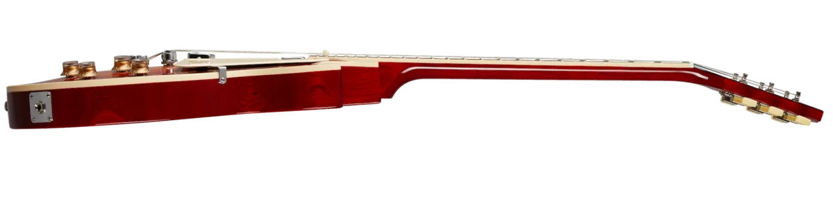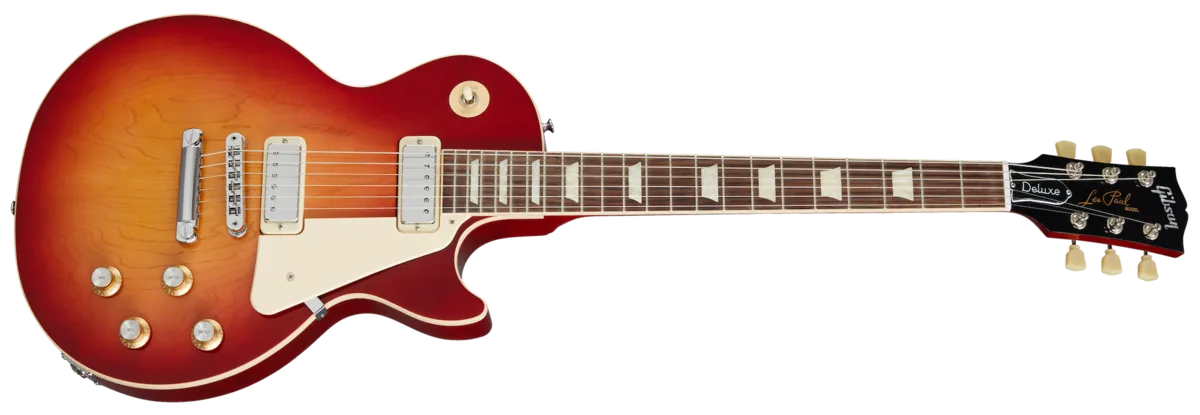 First released in 1969, the Deluxe saw the introduction of the Mini Humbucker™ to the Les Paul™ lineup. Mini Humbuckers retain the hum-free performance of their full-sized cousins but with a somewhat clearer and brighter tonality. The new Deluxe has features that were inspired by those early models from the 1970s, with a non-weight relief mahogany body and bound maple top, a bound mahogany neck with a Rounded C profile, vintage-style Keystone tuners, a Graph Tech® nut, and a traditional Les Paul control layout with 2 Volume and 2 Tone controls hand-wired with Orange Drop® capacitors.