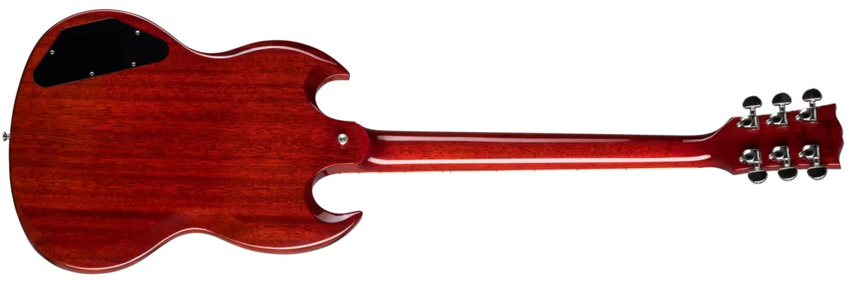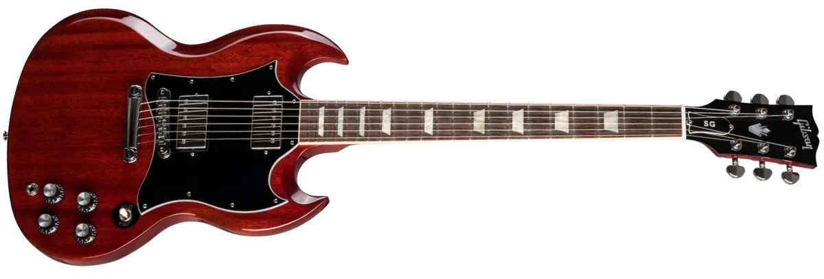 The Gibson SG Standard rocks the classic looks and features associated with the late 60's style SG models sought after by many. A rounded profile mahogany neck, bound rosewood fingerboard, long tenon 19th fret neck joint, and a solid mahogany body provide the backbone for singing sustain. The 490R and 490T Alnico II pickups provide the power to drive. A black, 5-ply, full-face pickguard set this SG Standard apart from others... a truly versatile classic.