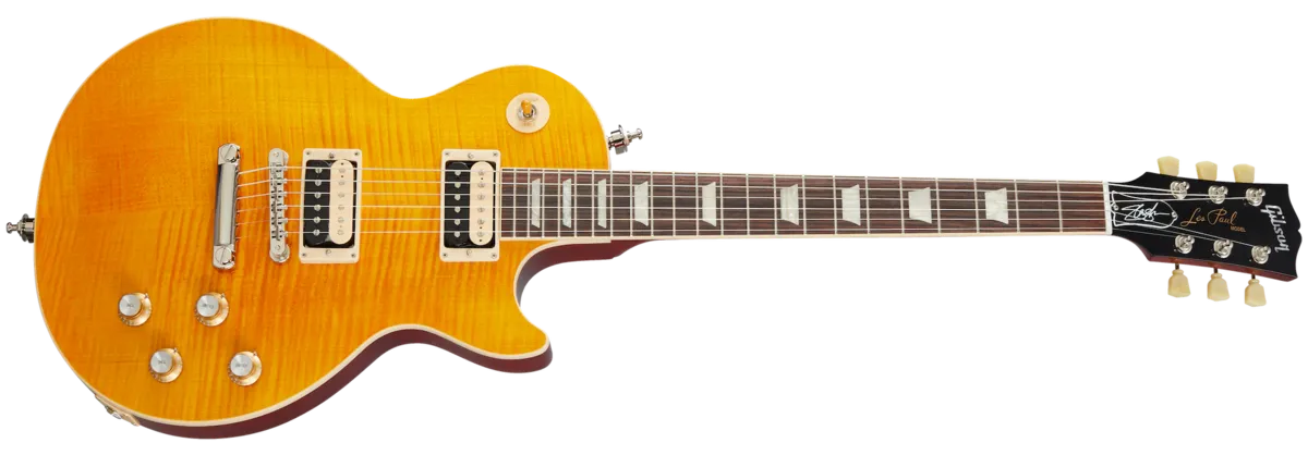 Gibson and Slash are proud to present the Slash Collection Gibson Les Paul™ Standard. It represents influential Gibson guitars Slash has used during his career, inspiring multiple generations of players around the world. The Slash Collection of Gibson guitars can be seen live on stage with Slash today. Each Slash Collection Gibson Les Paul Standard features a AAA flamed maple top, a solid mahogany body, and Slash’s personal touches including a 50s neck profile, Gibson Custom BurstBucker™ Alnico 2 pickups, color-coordinated hardware appointments, hand-wired electronics with Orange Drop® capacitors, and a vintage-style brown hardshell case. Exclusive to the Slash Collection are Slash’s “Skully” signature drawing on the back of the headstock, Slash’s signature on the truss rod cover, a blank truss rod cover in the case, Slash-approved Ernie Ball® strings, and four Slash Jim Dunlop Tortex® picks. The Slash Les Paul Standard is available in November Burst and Appetite Burst.