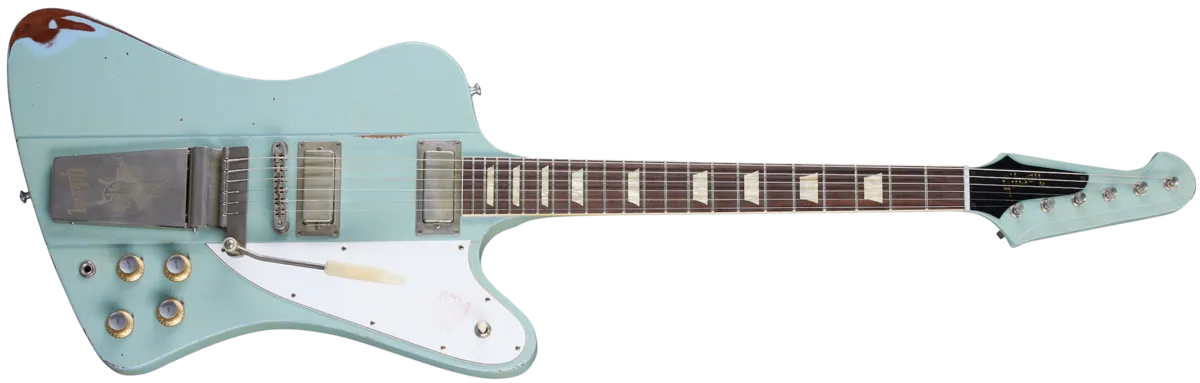 When Gibson hired famed automotive designer Ray Dietrich to create a radical new solid body guitar, Rock 'n Roll history ensued. With its offset shape, neck-through construction and scorching mini-humbuckers, the '63 Firebird™ V became an instant classic. The Gibson Custom Shop is proud to present this exacting replica of a vintage original, which uses authentic contours, dimensions, and construction methods for an incredible ownership and playing experience. It features a Maestro™ Vibrola. It also features Heavy Aging by the skilled artisans of the Murphy Lab. The Murphy Lab Heavy Aged finish treatment, paired with heavily aged hardware, simulates decades of heavy play wear, giving it the unique character, vibe, and feel of an original example from the Gibson Golden Era.