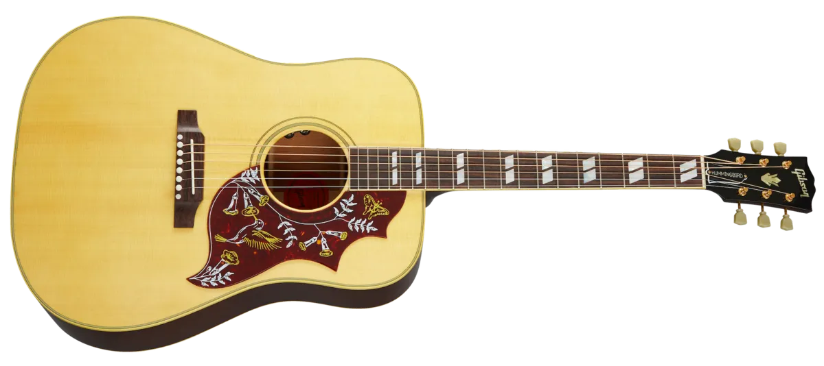 The unmistakable Gibson Hummingbird™ is followed by the masses as one of the most remarkable acoustic guitars ever built. The new Hummingbird Original blends vintage appointments and today's modern, high-quality build construction. Outfitted with gold Gotoh Keystone tuners, double antiqued binding, a traditional Hummingbird truss rod cover, and a bone nut and saddle, it's available in Antique Natural or Heritage Cherry Sunburst finish.