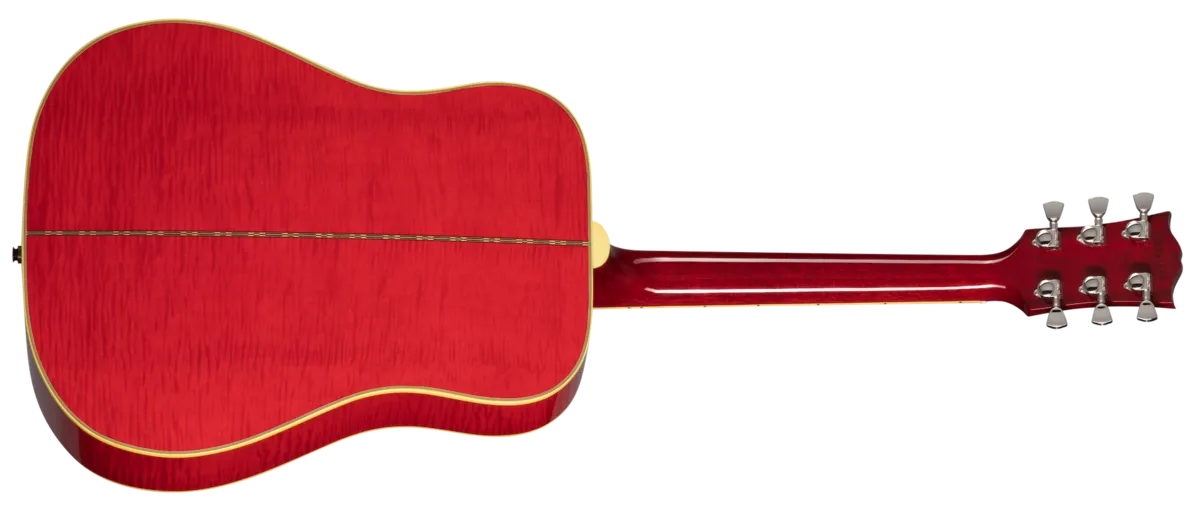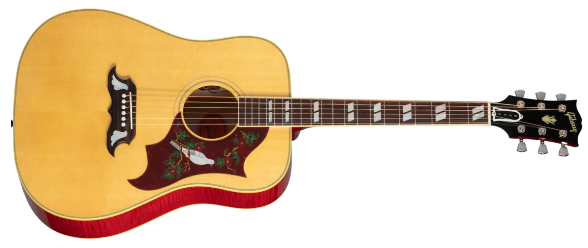 This famous flame maple-backed square-shoulder introduced in the early 60s is intertwined with one of the most revolutionary decades in popular music history. Its maple back and sides and long scale produce crisp, clear tone and projection, while the square-shoulder body adds balance and warmth. Classic Dove™ details include a bone nut and saddle, double antiqued multi-ply binding, nickel Grover® Keystone tuners, a traditional Dove truss rod cover, and a cherished pickguard featuring an inlaid mother-of-pearl Dove with hand-engraved and painted detailing.