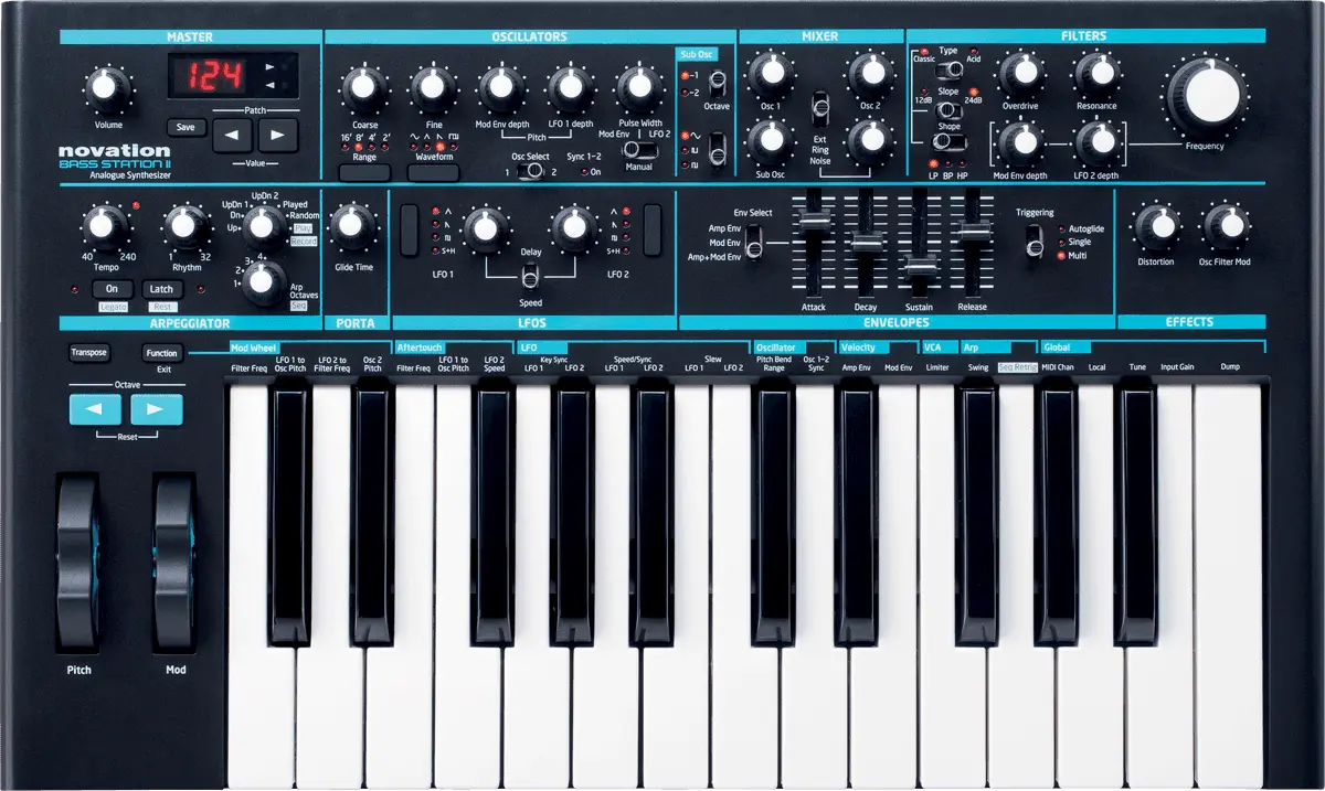 It has two tuneable oscillators, a sub-oscillator for enormous bass, plus noise and ring modulation. It also gives you two distinct analogue filter types: the classic multi-mode filter and a new acid filter, for a massive variation in sonic possibilities.