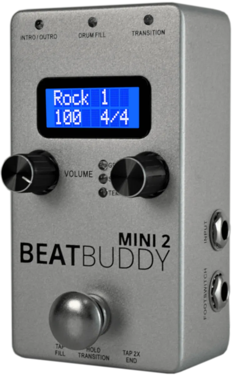BeatBuddy MINI 2 er en mer kompakt og rimeligere versjon av den prisvinnende BeatBuddy trommepedalen. Brukes bl.a. av School of Rock, Taylor Robinson Guitar, Frost School of Music (University of Miami) som et verktøy for effektiv og engasjerende øving.