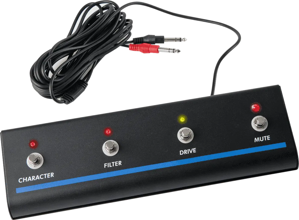 EBS Remote Footswitch for EBS Reidmar 750, EBS Fafner II, TD660, HD360 and EBS NeoGorm combos. Controls Drive (on/off), Character Filter(s) (on/off), EQ Filters (on/bypass) and Mute.