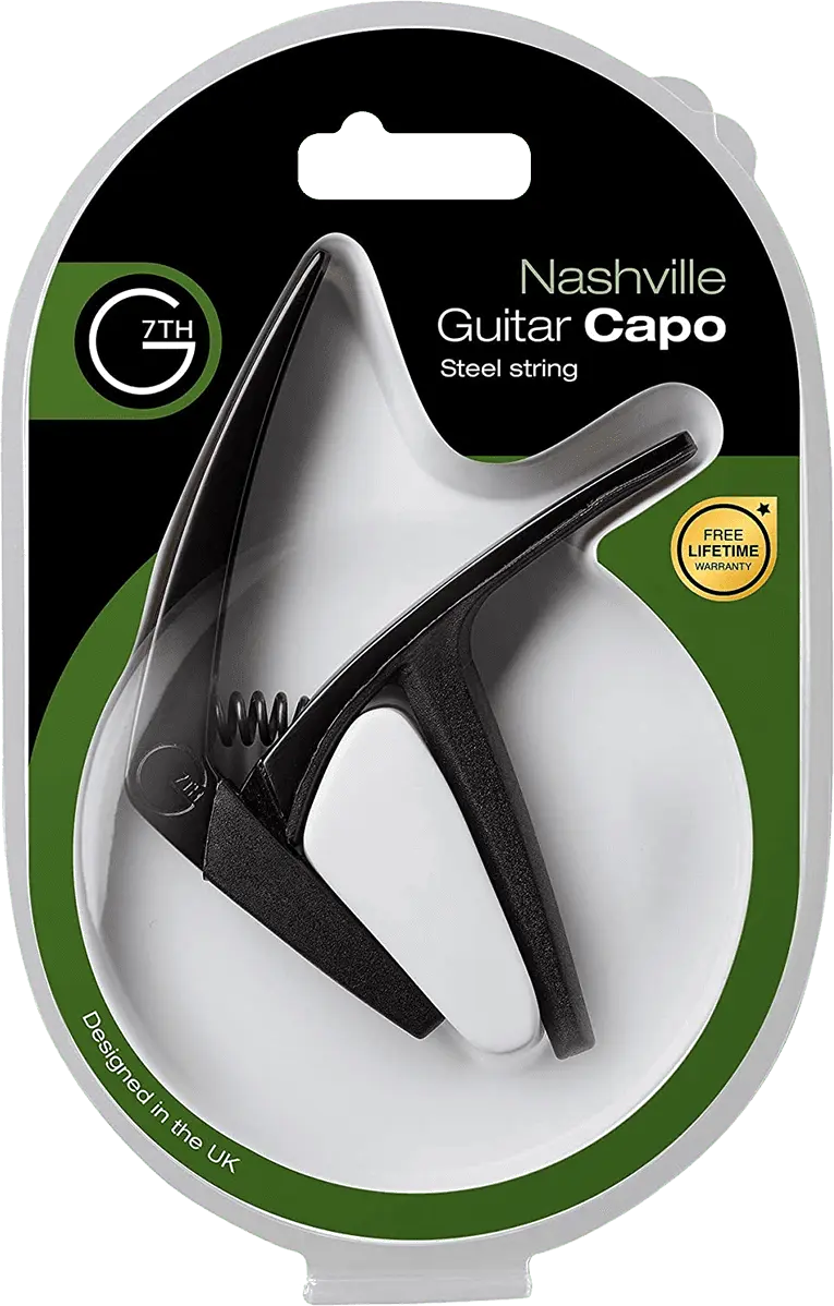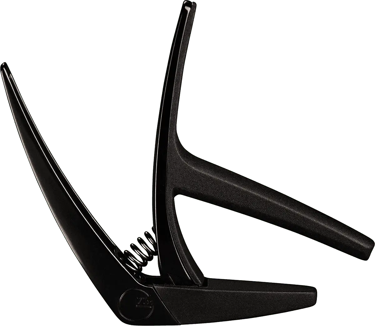 This acoustic guitar lightweight capo for quick one-hand operation has improved intonation by shifting the pivot point behind the neck and using a softer spring than common for such a model. The slim and elegant design can be clipped to the headstock when not used.