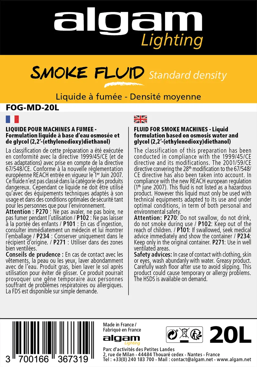 An ideal compromise for creating a moderately foggy atmosphere while enhancing light shows on stage with a uniform smoke. Algam Lighting fluids are manufactured in France according to an extremely strict process, in compliance with all the legal standards for these products. Reliable and efficient, Algam Lighting fluids are compatible with most machines on the market.
