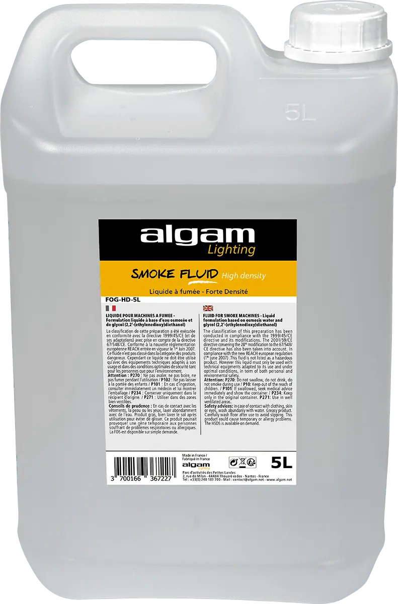 High-density fluids produce a compact and uniform smoke; they will be ideal for an actual permanent foggy effect in large spaces, thanks to their increased stability. Algam Lighting fluids are manufactured in France according to an extremely strict process, in compliance with all the legal standards for these products. Reliable and efficient, Algam Lighting fluids are compatible with most machines on the market.