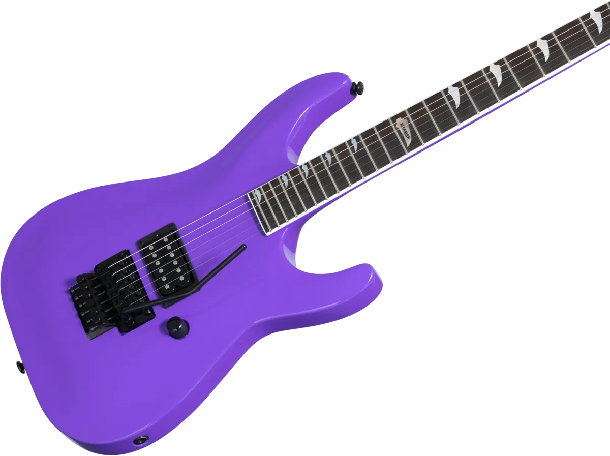 The SM-1 H is an exciting new version of the SM-1 and an updated version of the original Kramer Stagemaster Mach II. It retains the neck-through, double-cutaway mahogany body, ebony fingerboard, and Floyd Rose® 1000 series tremolo and R2 1000 series locking nut of the original SM-1, but has simplified electronics consisting of a single volume control with push/pull series/parallel switching and a Seymour Duncan® JB™ humbucker™ in the bridge position. Available in Buzzsaw Gold, Shockwave Purple, and Tronius Silver.