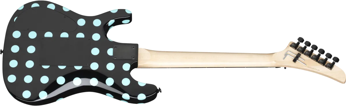 The Kramer Nightswan was first released in the late 1980s and quickly became a Kramer classic. The new Nightswan features a double cutaway Mahogany body in an Ebony finish with blue polka dots. The bolt-on 3-piece Hard Maple neck has a “C” profile with an Ebony fingerboard, a 24.75" scale, medium jumbo frets, a 16" radius, a Floyd Rose® RS Lock Nut, and pearloid inlays in a unique wave pattern. The traditional Kramer headstock has the original ‘Nightswan’ logo.