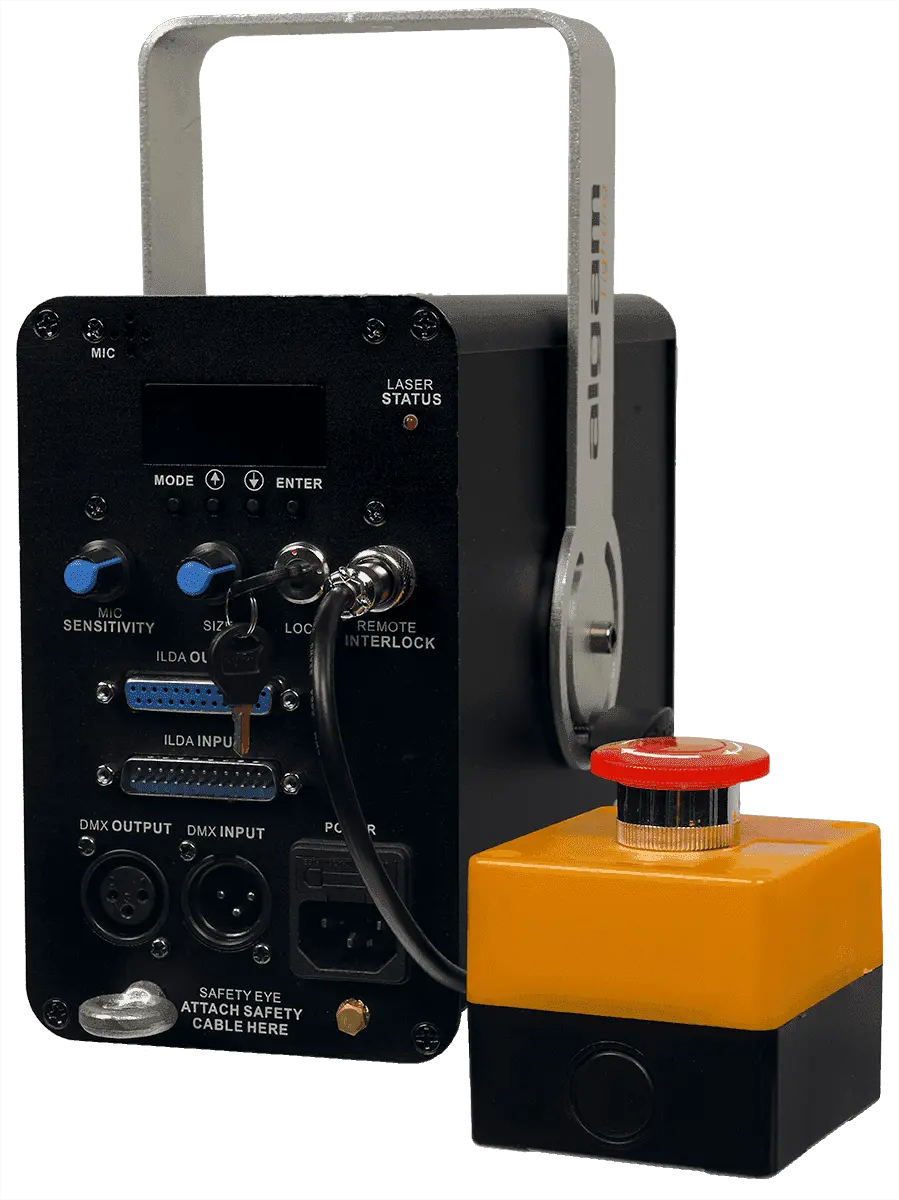 The interlock is an emergency switch compatible with Algam Lighting's SPECTRUM LASERS. A single press of the red button equipped with a 5-metre-long cable and a lockable Interlock connector immediately shuts down SPECTRUM lasers in compliance with current European safety standards.