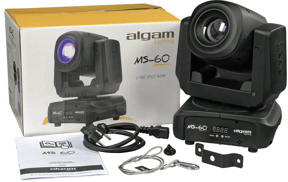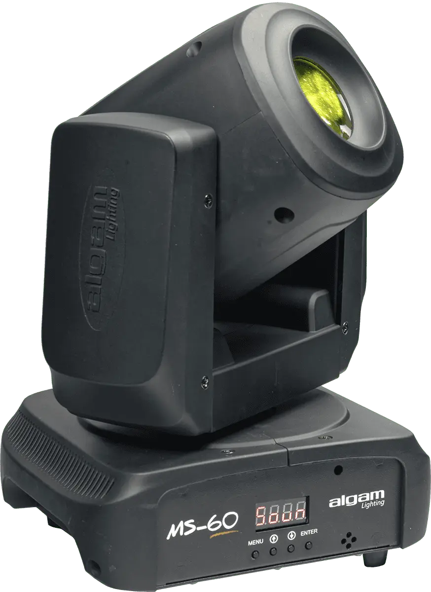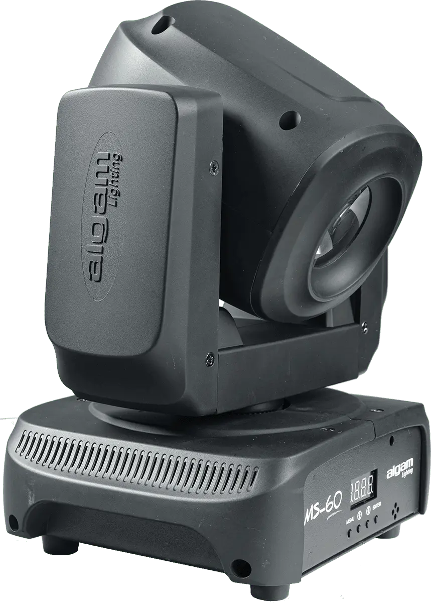 The MS60 spot moving head has a remarkably compact design and projects a powerful beam thanks to its 60W white LED. Its 8-gobo wheel coupled with an 8-colour wheel, its motorised focus and triple prism guarantee multiple and powerful light effects. With a quiet, professional-grade motor, this projector quickly and accurately pans up to 540° and tilts up to 270°. The moving head can be remotely controlled via its DMX input/output and set to automatic or music-controlled mode with its built-in control panel.