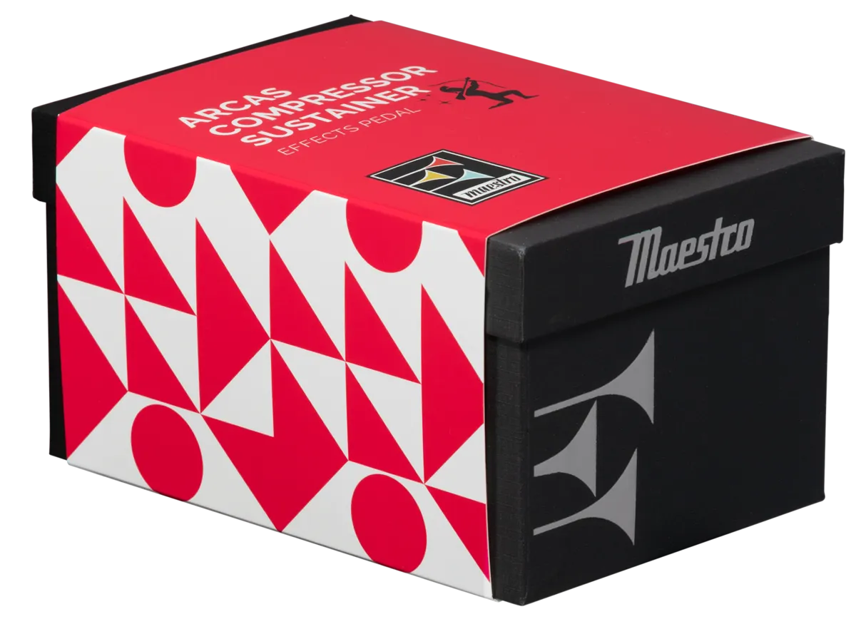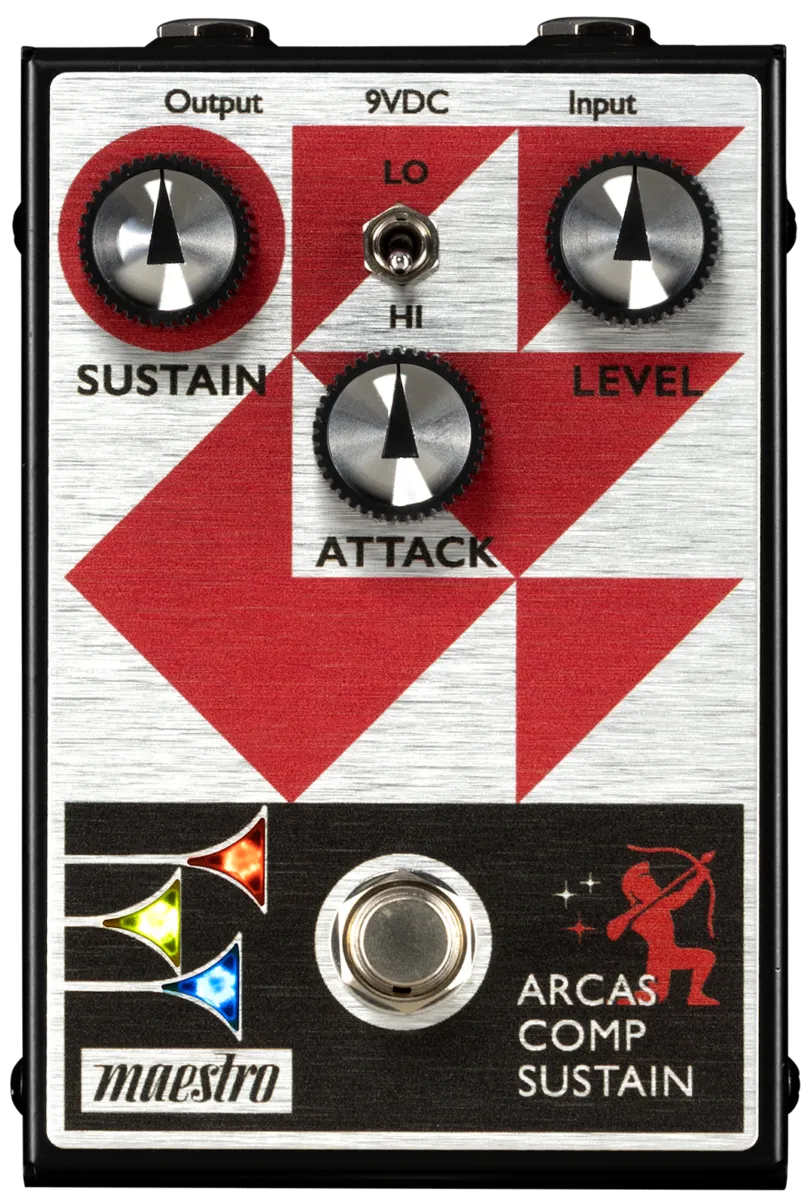 The Maestro Arcas Compressor Sustainer pedal provides excellent versatility. It offers both transparent, light compression as well as heavy, tight compression. It delivers enough sustain and level compensation to become a go-to workhorse for any situation. This all-analog pedal boasts a two-position Mode toggle switch for increased sonic versatility. The LO mode is less sensitive to pick attack, while the HI mode is more sensitive to pick attack. The intuitive 3-knob control layout lets users quickly dial up the desired Sustain (amount of gain applied during compression), control the Attack (how fast the compression engages), and adjust the amount of gain compensation and the pedal’s overall output volume with the Level control. The true bypass footswitch triggers the LED lights in the bugles in the Maestro logo when it’s on, so you’ll always know when the effect is active.