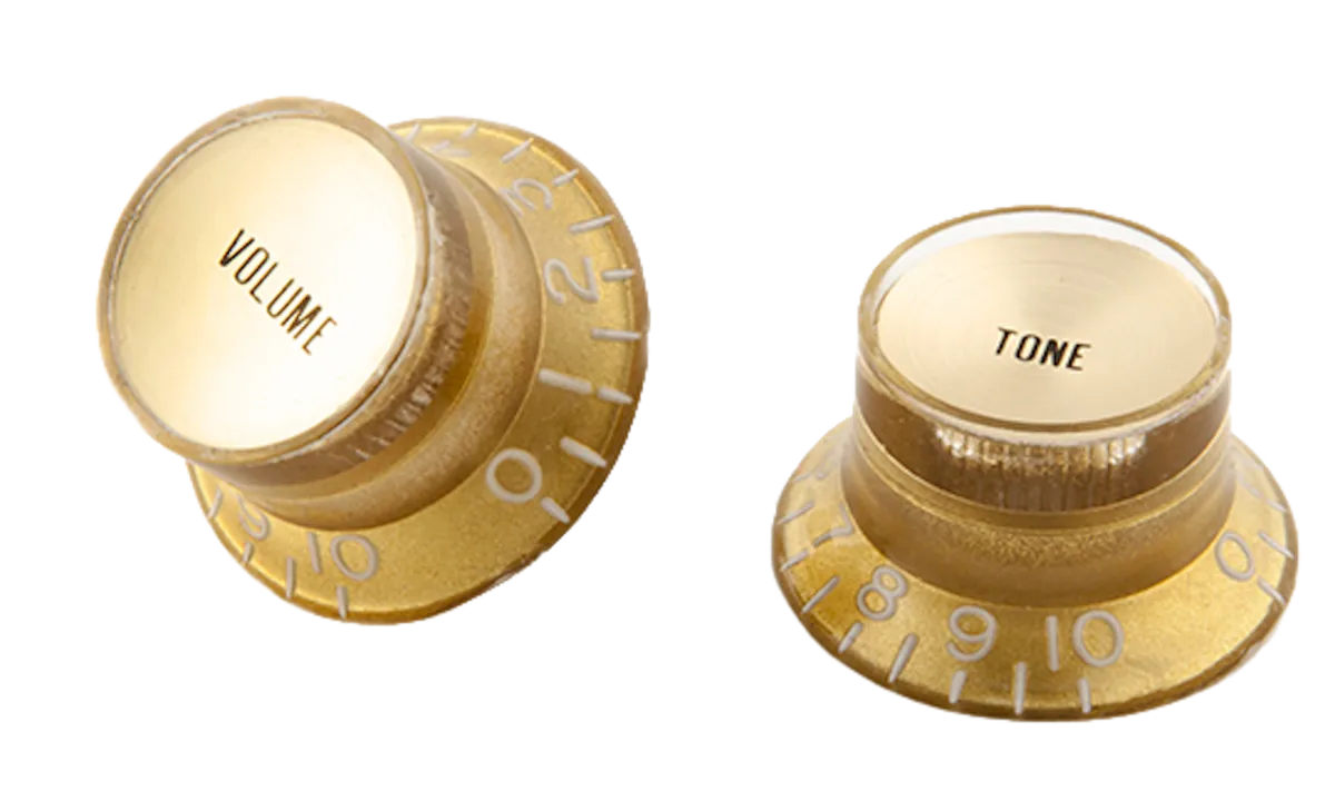 These genuine Gibson OEM top hat style knobs are the same knobs found on many Gibson SG models, but can also be used for any vintage restoration project, changing your guitar's look, or for the replacement of lost knobs. These black Gibson top hat style knobs with silver metal inserts come packaged in sets of four: two volume and two tone.