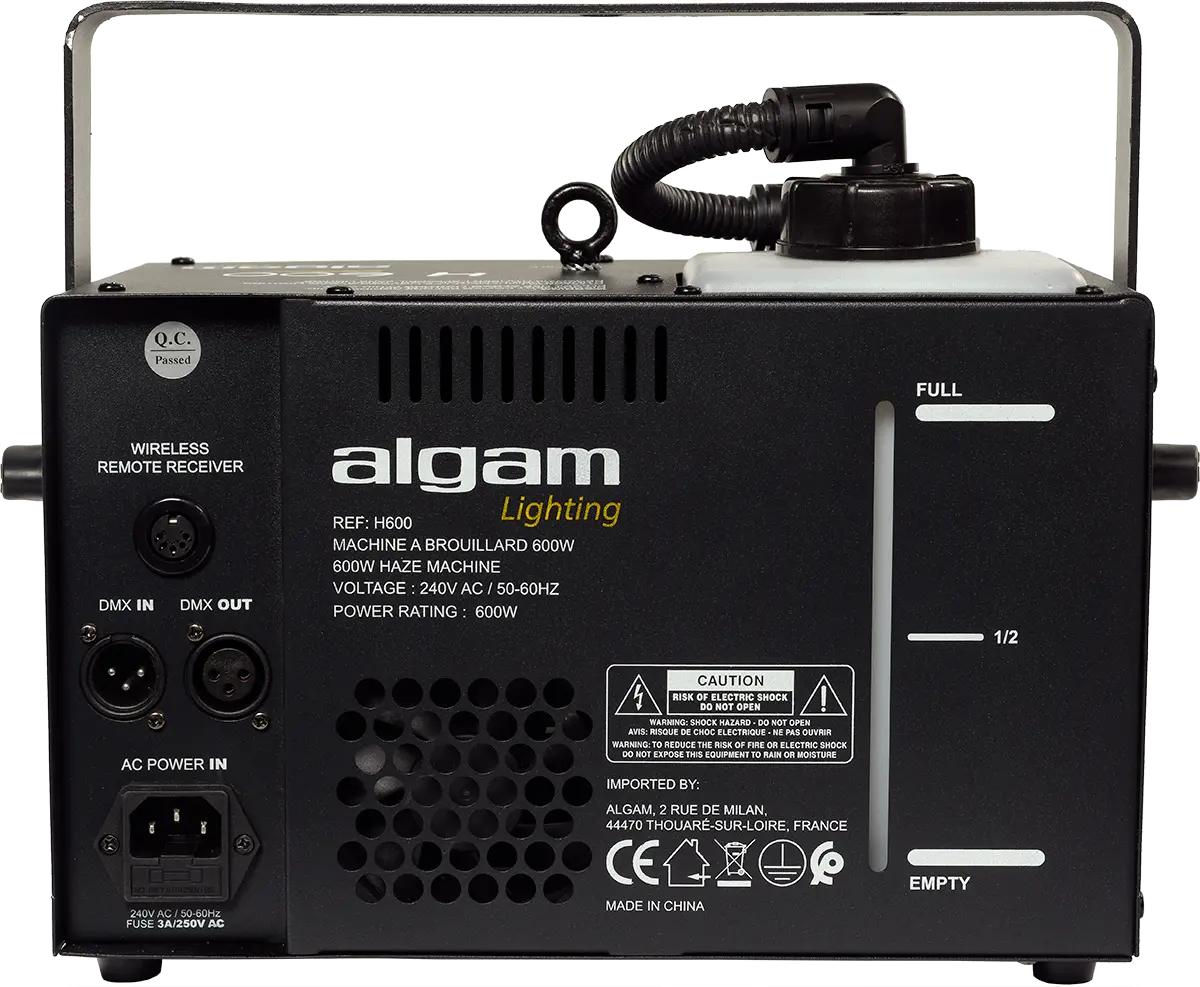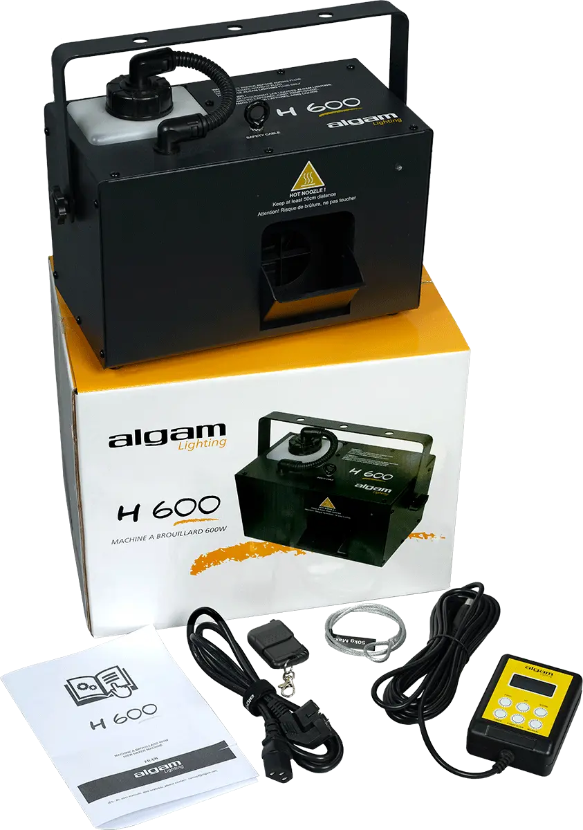 Given its 600W power, the H600 is a surprisingly compact haze machine that will enhance your light shows with its dense and steady haze production. Its robust steel construction, its large 1.2-litre tank and its record heat-up time of 40 seconds make it the ideal haze machine for private parties or all events in medium-sized rooms. The H600 offers different operating modes and numerous settings (trigger intervals and durations, auto timer, smoke volume output, fan speed), all DMX controllable or directly from the wired remote control with LCD display. For an optimal result, Algam Lighting recommends using haze fluid.
