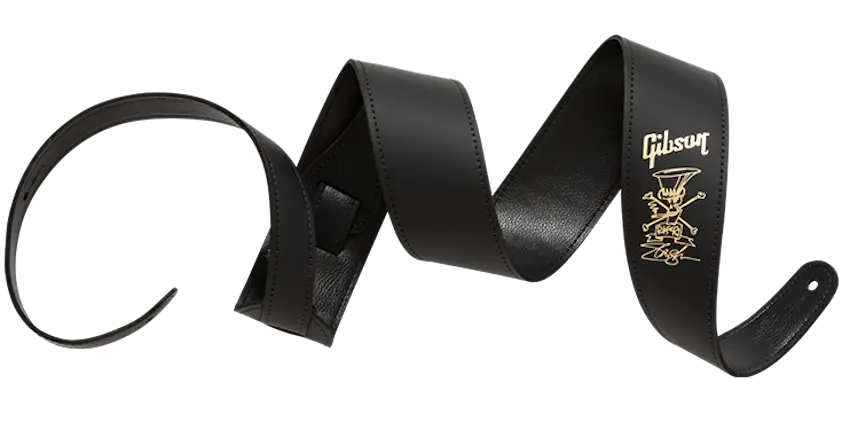 This sleek, adjustable length Slash Collection premium black leather guitar strap features the iconic Slash 'Skully' logo and Gibson logo in gold foil, making it the perfect accessory for your guitar.