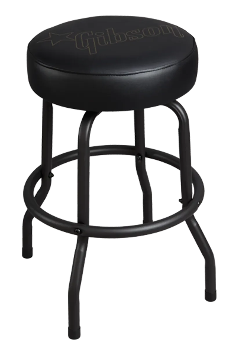 This 24" high playing stool has a swiveling vinyl seat that is padded for comfort and emblazoned with the Gibson Star logo. The classic barstool-style tubular steel legs are matte black, and a foot ring is included for extra comfort.