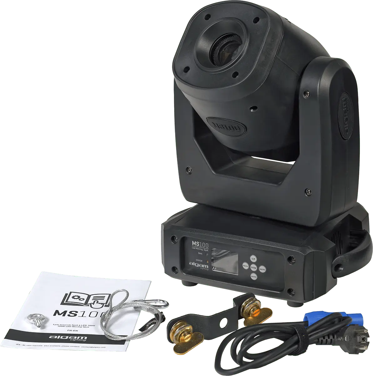 The MS100 features a powerful 100W white LED light source, two gobo wheels, one fixed and one motorised, and a colour wheel for a wide range of impressive effects in a successfully designed frame. This featherweight device developed for lighting professionals weighs only 5.9kg but is packed with resources. With its motorised focus and 6-facet variable speed prism, the MS100 is suitable for a wide range of fixed and mobile applications. Its quiet motorisation allows panning up to 540° and tilting up to 270° with tremendous flexibility and speed. The MS100 moving head can be controlled by DMX (14 channels) or configured via the integrated control panel. It can also operate in automatic or music-controlled mode. This professional projector has a power supply with Powercon input and output for chaining devices and 2 OMEGA sockets for safe installations.