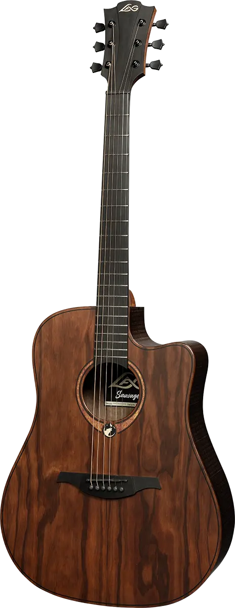 Mirroring the iconic Lag headstock design on the bridge and featuring black machine heads, the Sauvage-DCE achieves an elegant symmetry. The rough sawn look on the back and sides, along with a light oil finish on BrankoWood components, add character and grace.