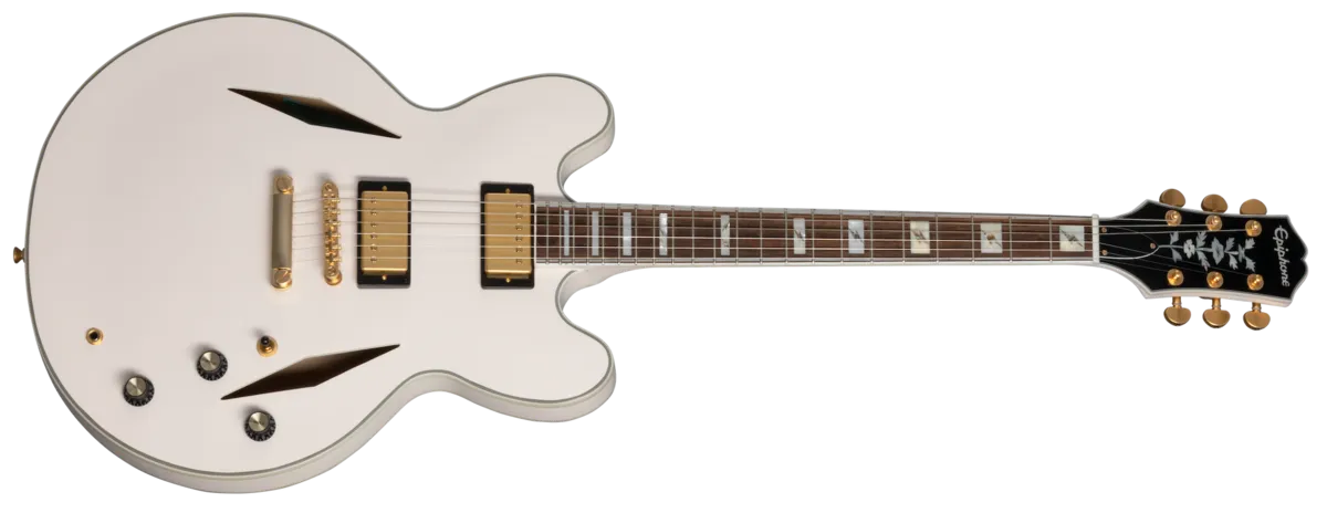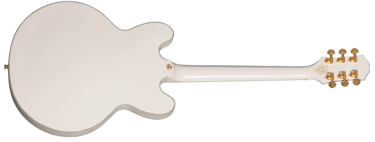 The Epiphone Emily Wolfe "White Wolfe" Sheraton is based on the triple-threat rock & roll singer, songwriter, and guitarist's popular Sheraton Stealth. Once again, Emily has lent her creativity to develop her new artist model. The Emily Wolfe "White Wolfe" Sheraton is equipped with an Indian laurel fretboard with 22 medium jumbo frets and mother of pearl block inlays with abalone lightning bolts. The headstock has a mother of pearl tree of life of inlay on the front, Emily's Wolfe logo and a white gloss Emily Wolfe signature on the rear, and is outfitted with Grover® Rotomatic® tuning machines and a Graph Tech® nut. An Epiphone LockTone™ Tune-O-Matic™ bridge and Stop Bar tailpiece hold down the other end of the strings and contribute (O the impressive sustain of the instrument. The electronics include full-sized Epiphone Alnico Classic PRO™ humbucker ™ pickups paired with CTS® potentiometers for smooth control over individual pickup volume and overall tone. It's finished in Aged Bone White paired with lightly aged gold hardware. An EpiLite™A case is included.