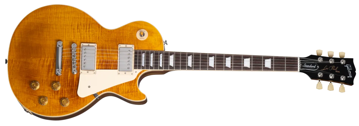 The Les Paul™ Standard 50s Figured returns to the classic design that made it relevant, played, and loved - shaping sound across generations and genres of music. It pays tribute to Gibson's Golden Era of innovation and brings authenticity back to life. It boasts solid mahogany body, an AA-figured maple top, and a distinctive translucent custom color nitrocellulose lacquer finish that showcases the figured maple top. The mahogany neck has a rounded 50s-style profile and a rosewood fingerboard with trapezoid inlays. The Les Paul Standard 50s Figured is equipped with an ABR-1, the classic-style Tune-O-Matic™ bridge. an aluminum Stop Bar tailpiece. Vintage Deluxe tuners with Keystone buttons, and aged gold Top Hat knobs. The calibrated Burstbucker™ (neck) and Burstbucker 2 (bridge) pickups are loaded with Alnico 2 magnets and wired to audio taper potentiometers and Orange Drop® capacitors. A hardshell case is also included.