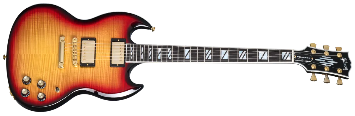 Gibson is excited to announce the return of the SG™ Supreme. With a refreshed feature set, it is bound to overshadow everything else in sight and be one of the most exciting new releases of the year. It features a beautiful AAA-figured maple top on a mahogany body. The mahogany neck has an ebony fretboard with a compound radius, 24 medium jumbo frets, and Super Split Block mother-of-pearl inlays. The headstock is adorned with a striking new mother-of-pearl "Chandelier Inlay" inspired