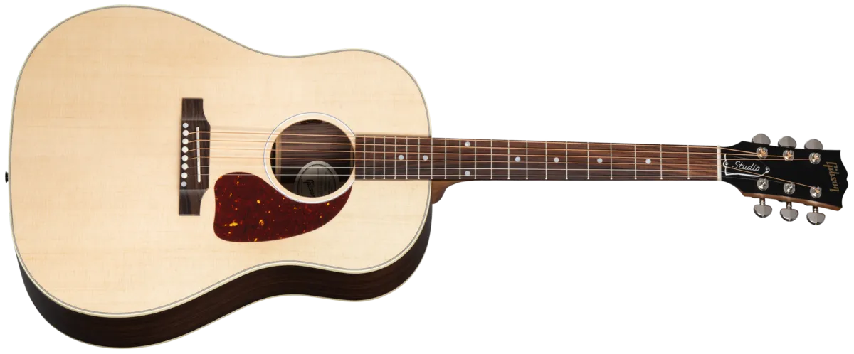 Turn heads with the J-45 ™ Studio Rosewood. Hand-built using solid rosewood back and sides and a solid Sitka spruce top, this updated J-45 Studio features a traditional body depth for warm, rich tone. The Advanced Response profile utile neck ensures smooth, easy playability. Available in Satin Natural and Satin Rosewood Burst finishes, the J-45 Studio Rosewood has an L.R. Baggs ™ Element Bronze active under-saddle piezo pickup for studio-quality plug-and-play anywhere. Packaged in an included hardshell case for portability, this J-45 Studio Rosewood is ready for the studio and the stage.