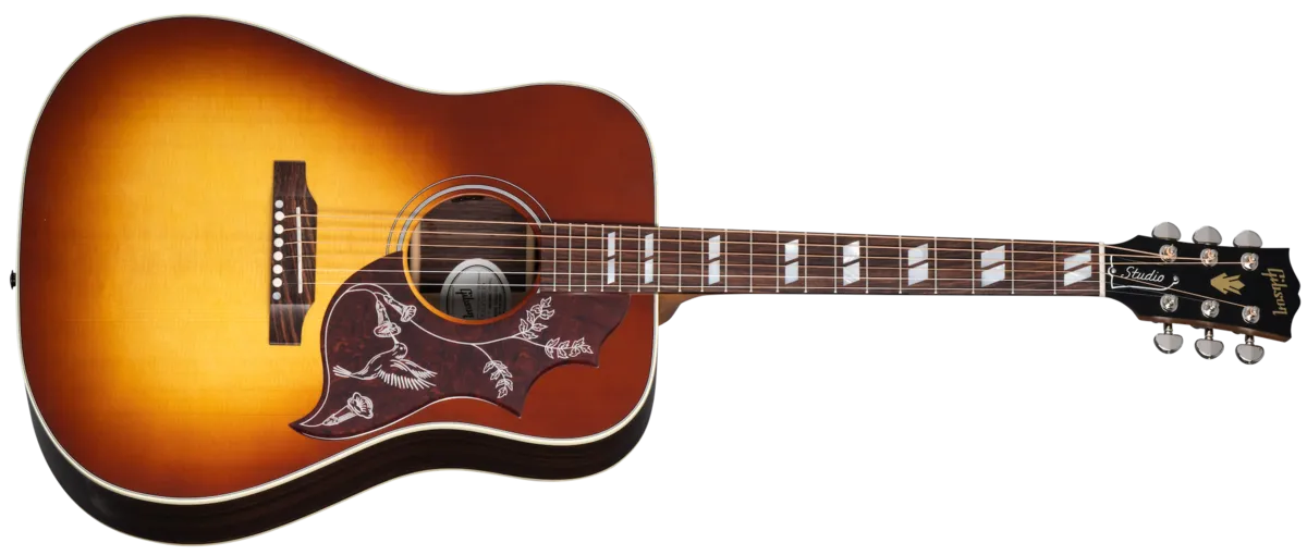 The Hummingbird ™ Studio Rosewood continues Gibson's long history of producing world-famous square shoulder body designs, such as the Hummingbird, Dove™, and Songwriter models. The updated Hummingbird Studio Rosewood is hand-built using all solid tonewoods and is equipped with an Advanced Response profile utile neck for smooth, easy playability. It features a full-depth body for enhanced tonal response and a satin nitrocellulose finish, giving it the look and feel of a long-treasured musical companion. Available in Satin Natural and Satin Rosewood Burst finishes (including a left-handed model), the Hummingbird Studio Rosewood has an L.R. Baggs™ Element Bronze active under-saddle piezo pickup for easy studio-quality plug-and-play anywhere. Packaged in an included hardshell case for portability, this is the Hummingbird you've been waiting for!