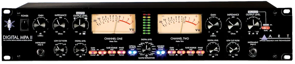 The all new ART Digital MPA-II delivers all of the same great features of the ProMPA with the added versatility of digital output. Like the ProMPA-II, each input circuit has 48v phantom power and features variable input impedance which can radically vary the overall performance of any high quality dynamic or ribbon microphone. The Digital MPA-II can be configured for dual mono or stereo operation with selectable mid/side mic support, summing the adjacent channel, to decode left/right signals.